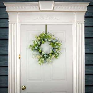 - This artificial hanging wreath is decorated with an assortment of blue flower blooms, colorful pastel eggs and features a swirl of long, leafy greens to create an additional natural appeal