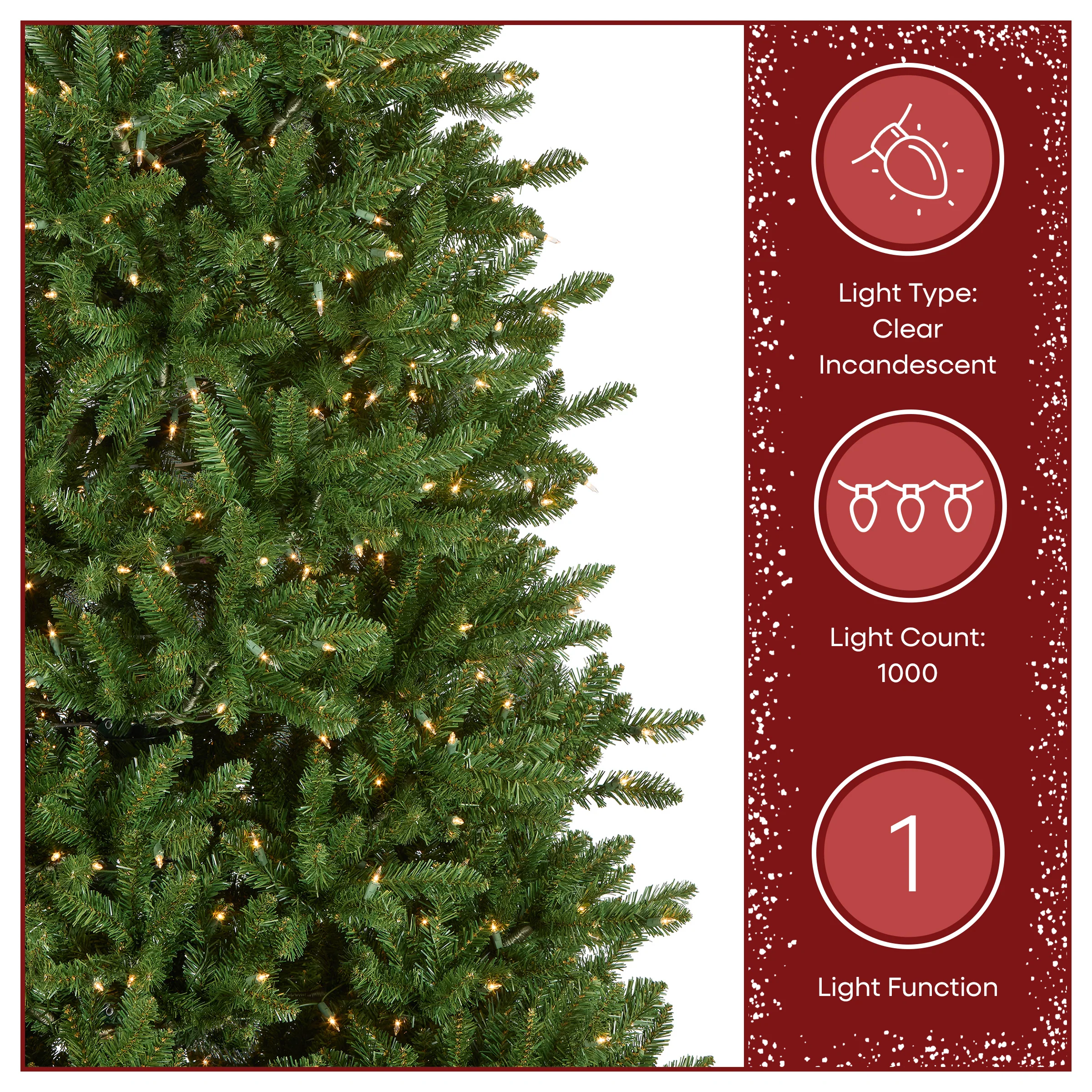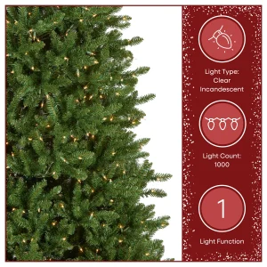 - PRE-LIT WITH 1,000 CLEAR LIGHTS: Arrives pre-strung for an easy set-up with 1,000 clear UL-listed incandescent lights that remain lit even if an individual bulb goes out, creating a cozy holiday glow