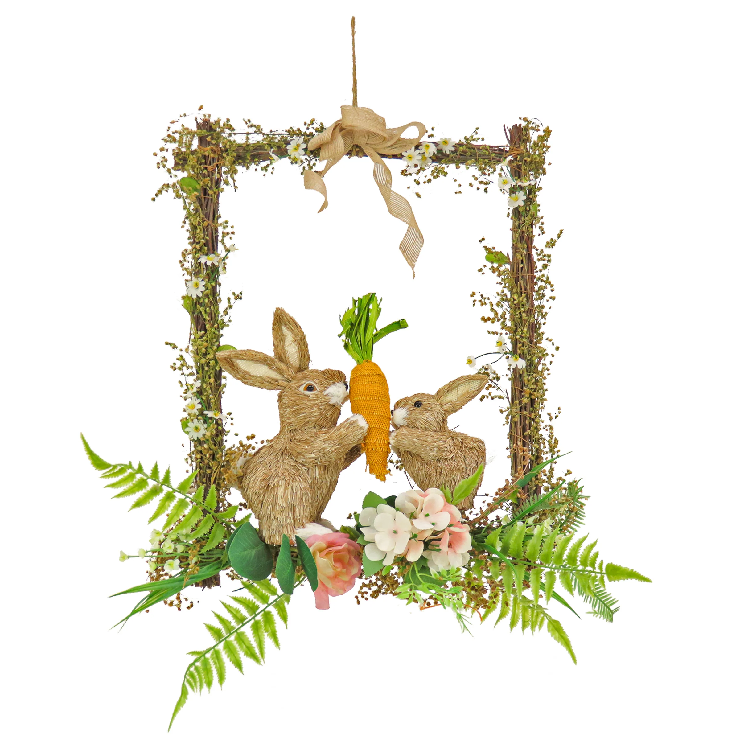 Capture the essence of the Easter season with National Tree Company’s Bunnies Hanging Wall Decoration. This gorgeous wall accent is decorated with large pink and white flower blooms, vibrant green fern fronds, berry clusters and two adorable bunnies holding a fabric orange carrot. Hang this delightful decoration on a door, wall, window or mantle indoors to add a fun and natural flair to any Easter-themed decorative arrangement. Handcrafted with sturdy, durable materials, this decoration is sure to capture the faithful and festive spirit of the Easter season for years to come. Includes one artificial hanging wall decoration that measures 14 inches in height, 9 inches in width and 4 inches in depth and is designed with twigs woven into the shape of a rectangular trellis. At National Tree Company, we believe that special holiday memories do not have to be far and few between; this Easter, let our decorations transform your home while you focus on creating more of those magical moments