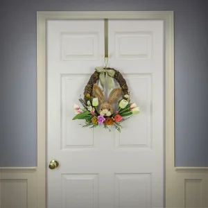 16 in. Easter Wreath Decorated with Multicolor Flower Blooms, Tulips, Leafy Greens, Bunny Head