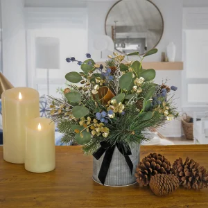 This Swiss Chic decorative arrangement features a mixture of evergreen and bristle branch tips tightly grouped together and seated in a round metal pot base. Other trimmings include pinecones, leafy greens, white twigs, clusters of blue berries and gold metal bells. A black velvet ribbon and bow add the finishing touch. This unique tabletop piece will add a touch of festive greenery to your holiday decorating scheme. For indoor display only.