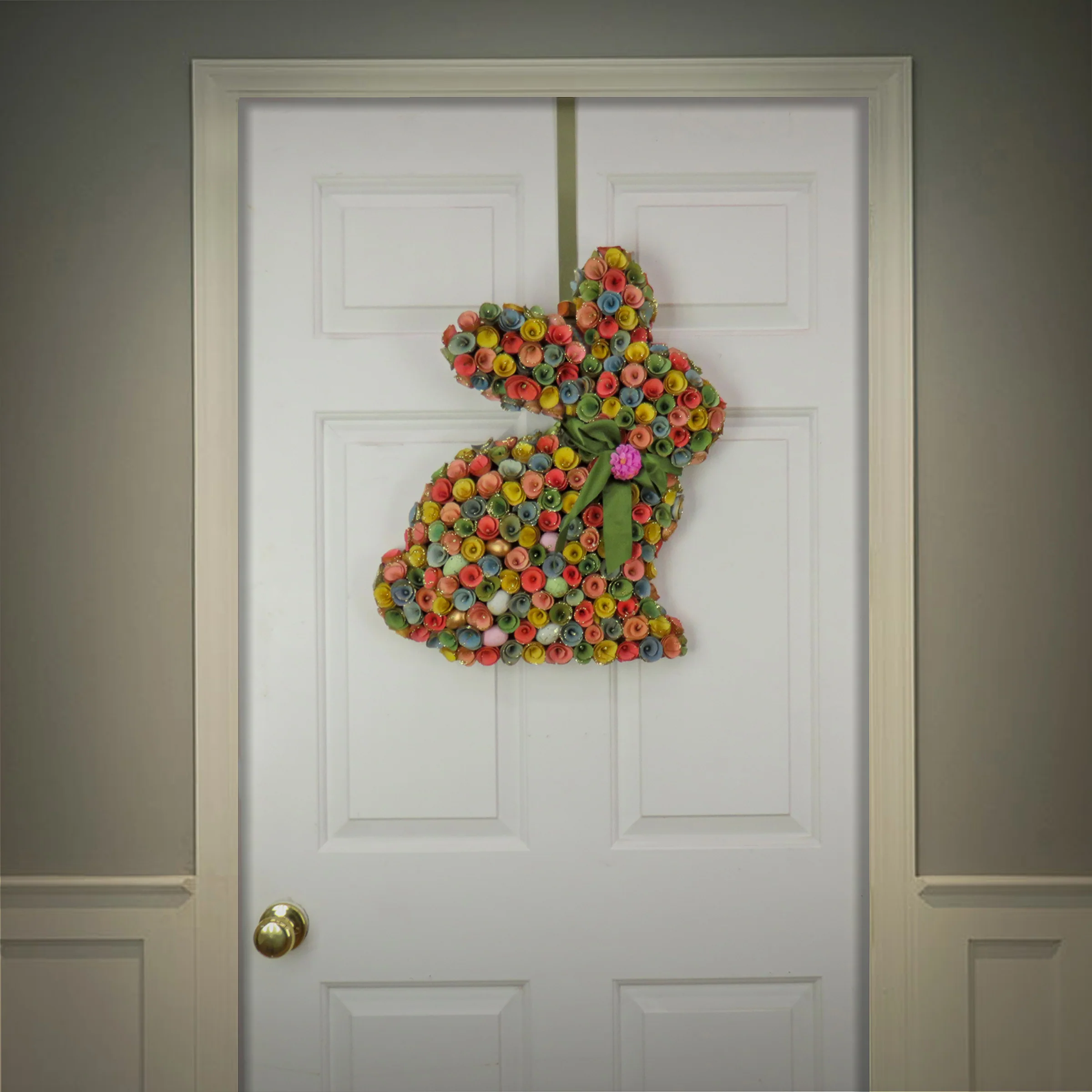- This artificial hanging bunny silhouette is decorated with colorful flowers made from thinly cut wood curls, pastel eggs tucked between the blooms and a silky green ribbon tied around the neck
