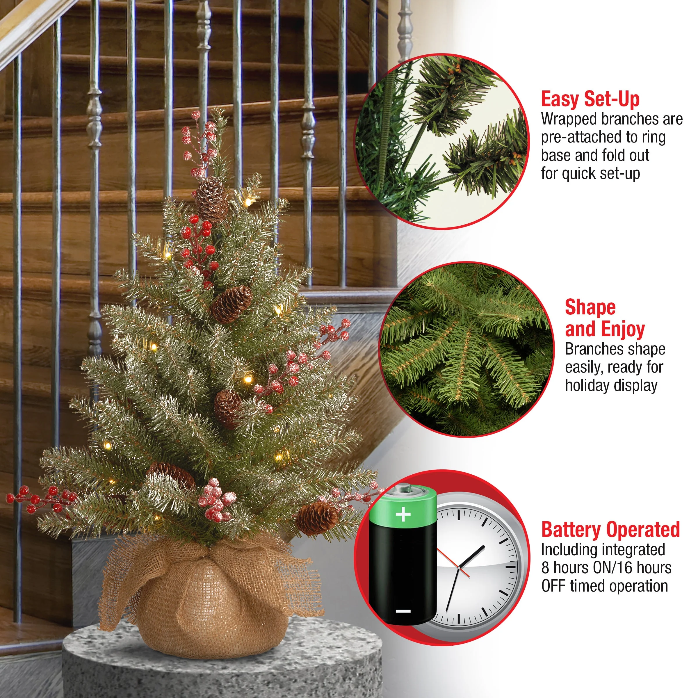 This Dunhill Fir tabletop tree will add a colorful accent to your holiday decorating scheme. Seated in a rustic burlap bag with red bow, this pine tree features pine cones and berries, and snow sprinkled branch tips. It is pre-strung with 15 battery operated warm white low-voltage LED lights that are energy-efficient, long lasting and cool to the touch. A convenient 6 hours ON/18 hours OFF timer controls light operation. Display indoor or covered outdoor locations.