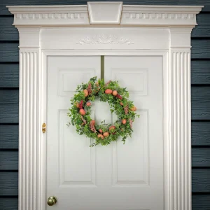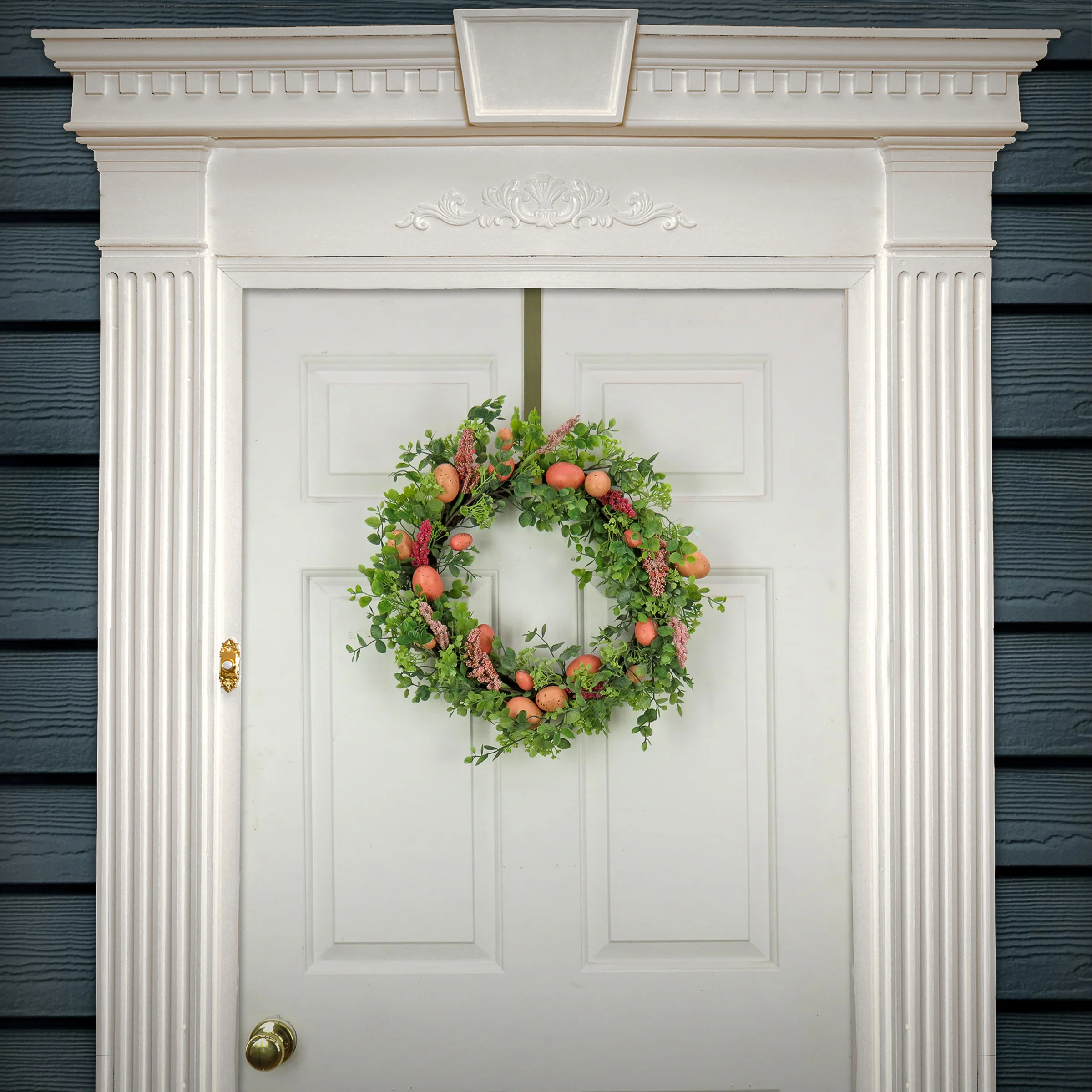 22 in. Easter Wreath Decorated with Pink Pastel Eggs, Pink Flowers, Leafy Greens