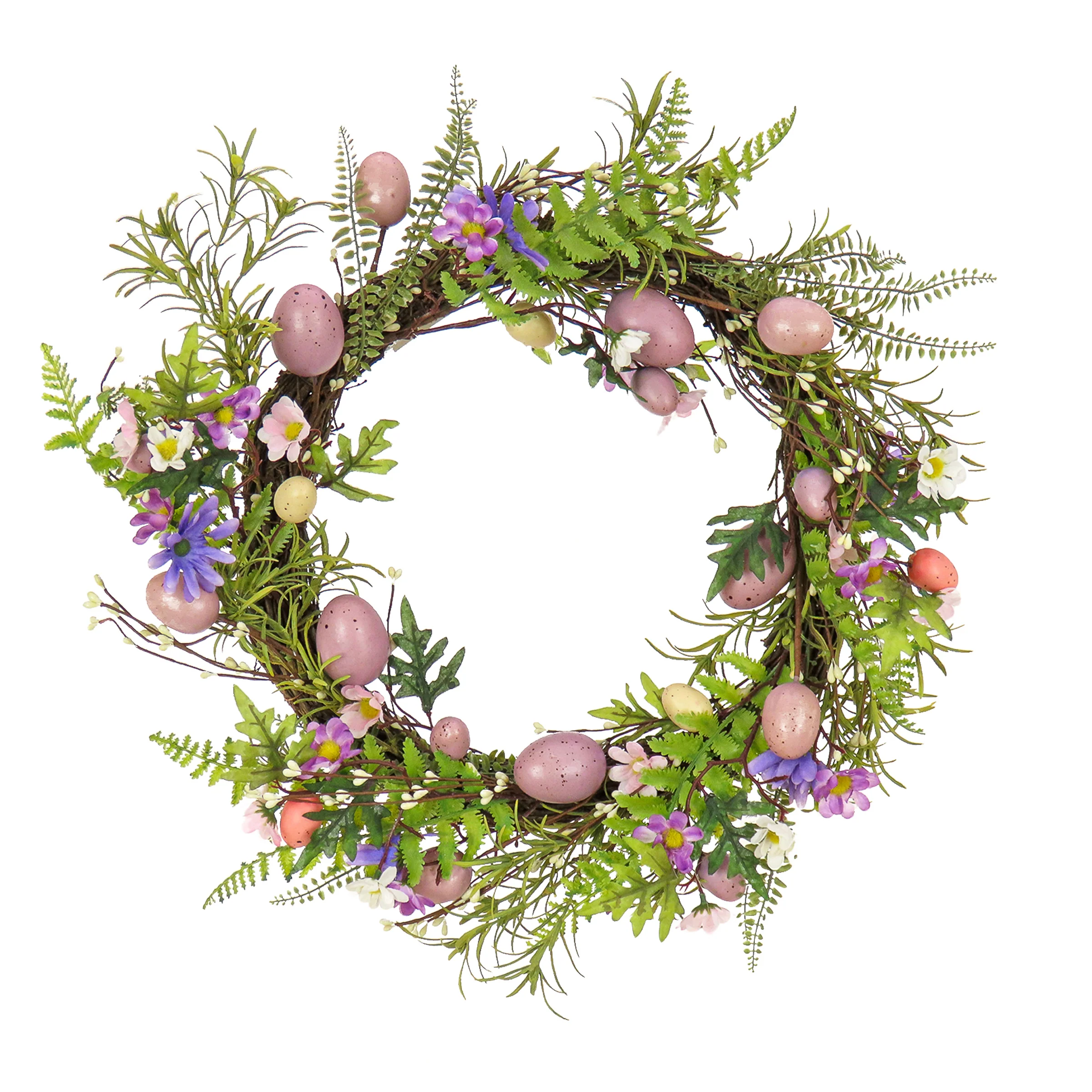 - ARTIFICIAL EASTER WREATH: An expertly crafted faux wreath featuring pink pastel eggs, purple flowers, ferns, and leafy greens, creating a welcoming and festive ambiance. Designed with a sturdy woven branch base, ensuring durability and a secure structure.