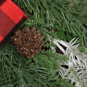 This Mixed Pine Berries wreath features a mix of evergreen branch tips and long-stem leafy greens bursting from a thick woven branch ring base. It is trimmed with petite pinecones and topped with a black and red buffalo plaid ribbon and bow. This unique and rustic holiday decoration can be displayed on door, wall, or window in indoor or covered outdoor locations.