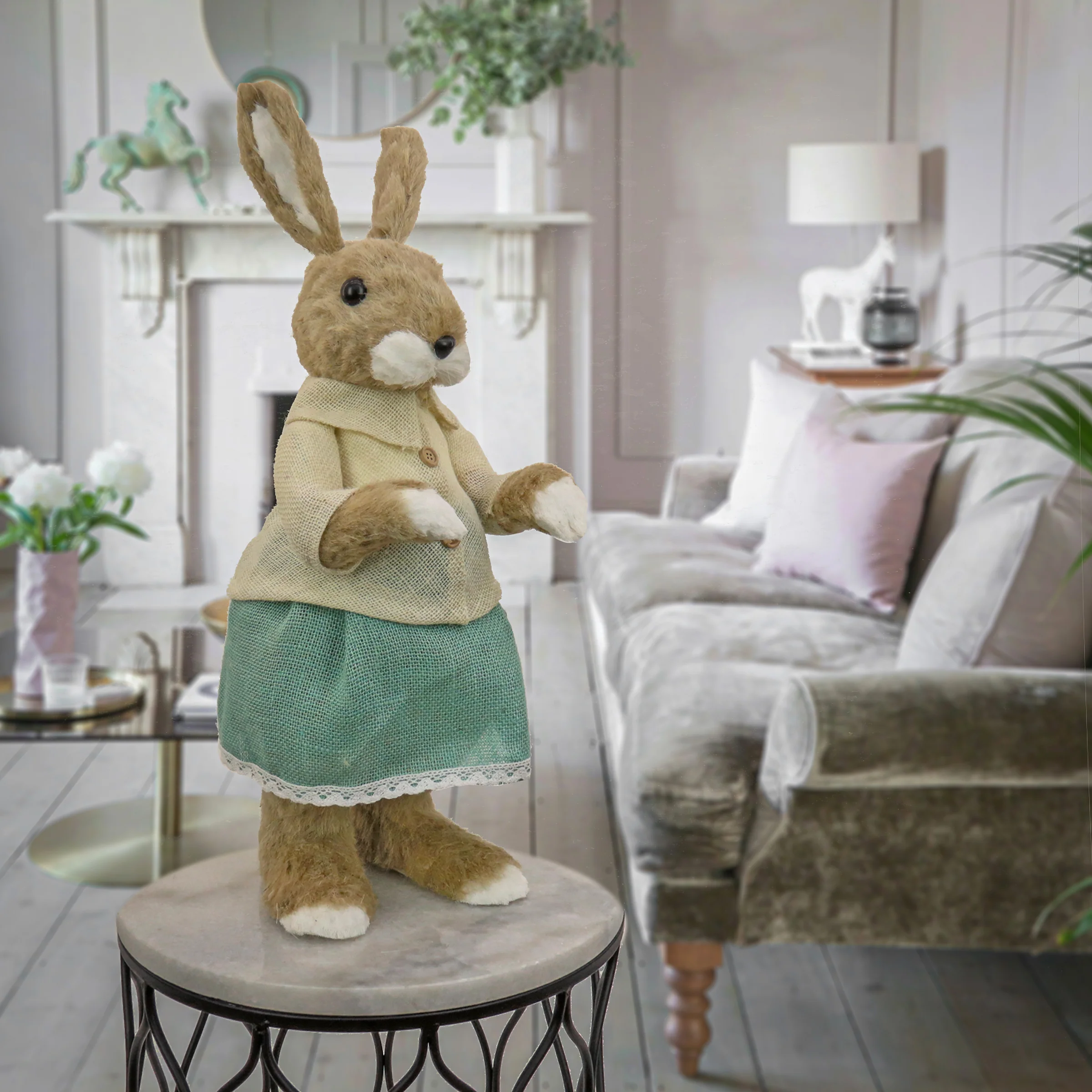 - This adorable table decoration is sure to bring Easter cheer, featuring a bunny dressed in a cotton, button up blouse and teal colored skirt