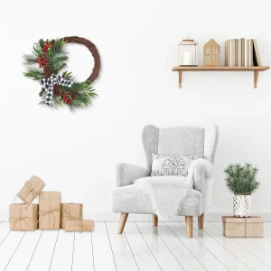 - Trimmed with red berries, pinecones, and buffalo plaid bow
