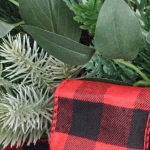 These decorative swags feature a mix of evergreen branch tips and long-stem leafy greens sprouting from woven branch bases. Each swag is trimmed with petite pinecones and topped with a black and red plaid ribbon and bow. Display these holiday accented swa