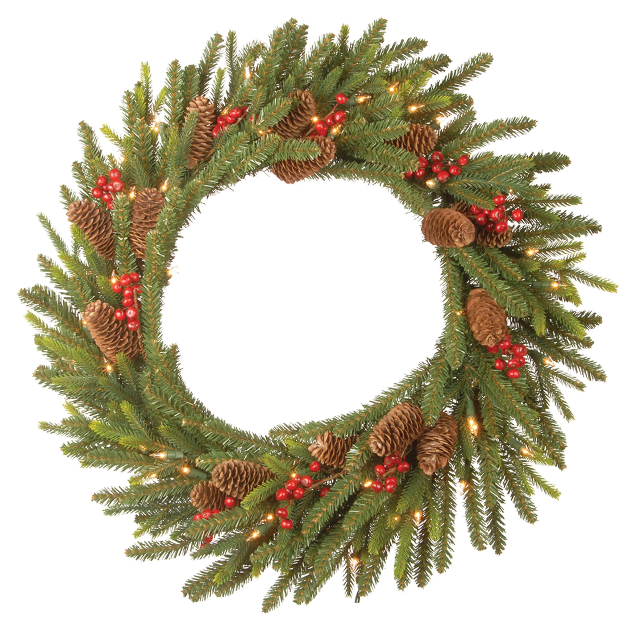 This Dorchester Fir wreath features Feel Real branch tip technology, creating a decoration with remarkable realism. These crush-resistant branch tips are molded from real tree branches for an authentic appearance. This wreath is trimmed with red berries and pine cones. It is pre-lit with 50 battery operated warm white LED lights that are energy efficient and long lasting. Inlcudes a 6 hours ON/18 hours OFF timed operation. Display this wreath on doors, walls and windows in indoor or covered outdoor locations.