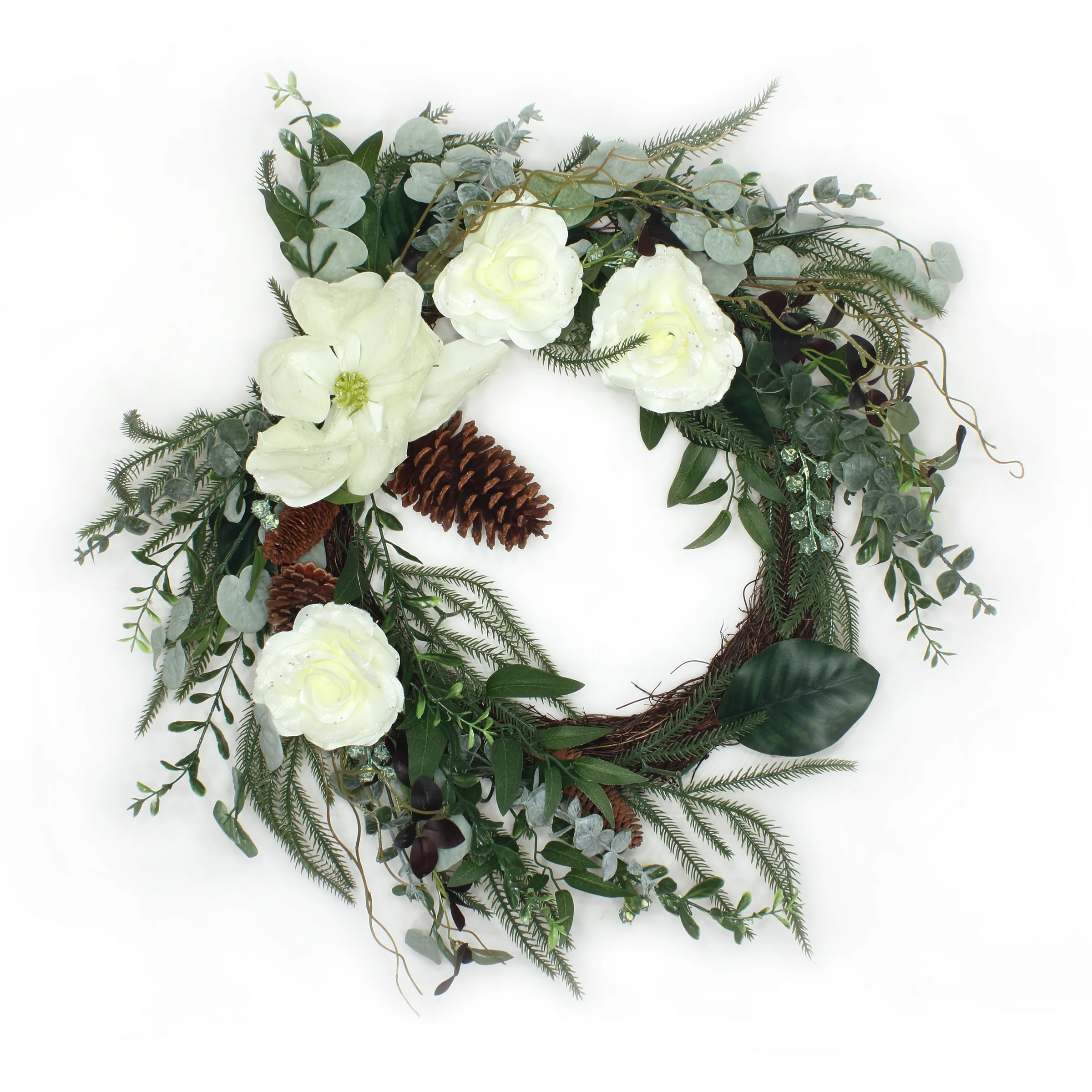 This Floral Mixed Christmas wreath features a mixture of long-stem leafy greens and curling evergreen tips swirling around a thick woven branch ring base. Beautiful white rose and magnolia flower blooms and assorted pinecones add complementing colors and natural appeal. This unique and rustic holiday decoration can be displayed on door, wall, or window in indoor or covered outdoor locations.