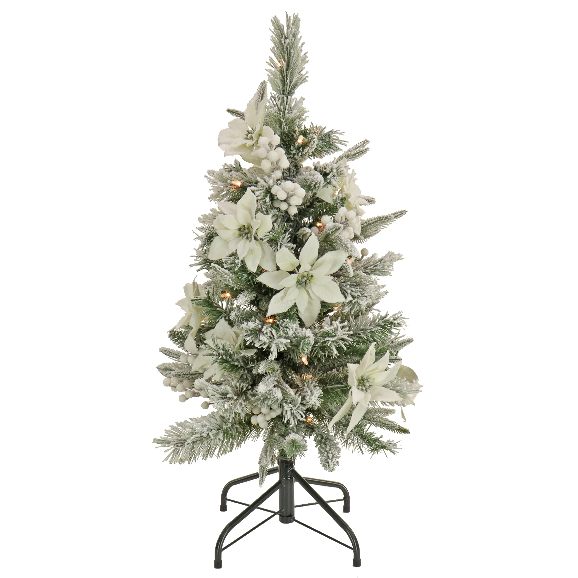 This snow dusted Frosted Colonial Fir Pencil Slim tree features Feel Real® branch tip technology, creating a tree with remarkable realism. These crush-resistant branch tips are molded from real tree branches for an authentic living tree appearance. This mixed tip tree is pre-lit with 50 clear lights that remain lit even if a bulb burns out, and is trimmed with white poinsettias and white berries. Crafted with high quality materials and hinged branches for easy set up and includes a sturdy metal folding stand. For indoor display only. Plug in.