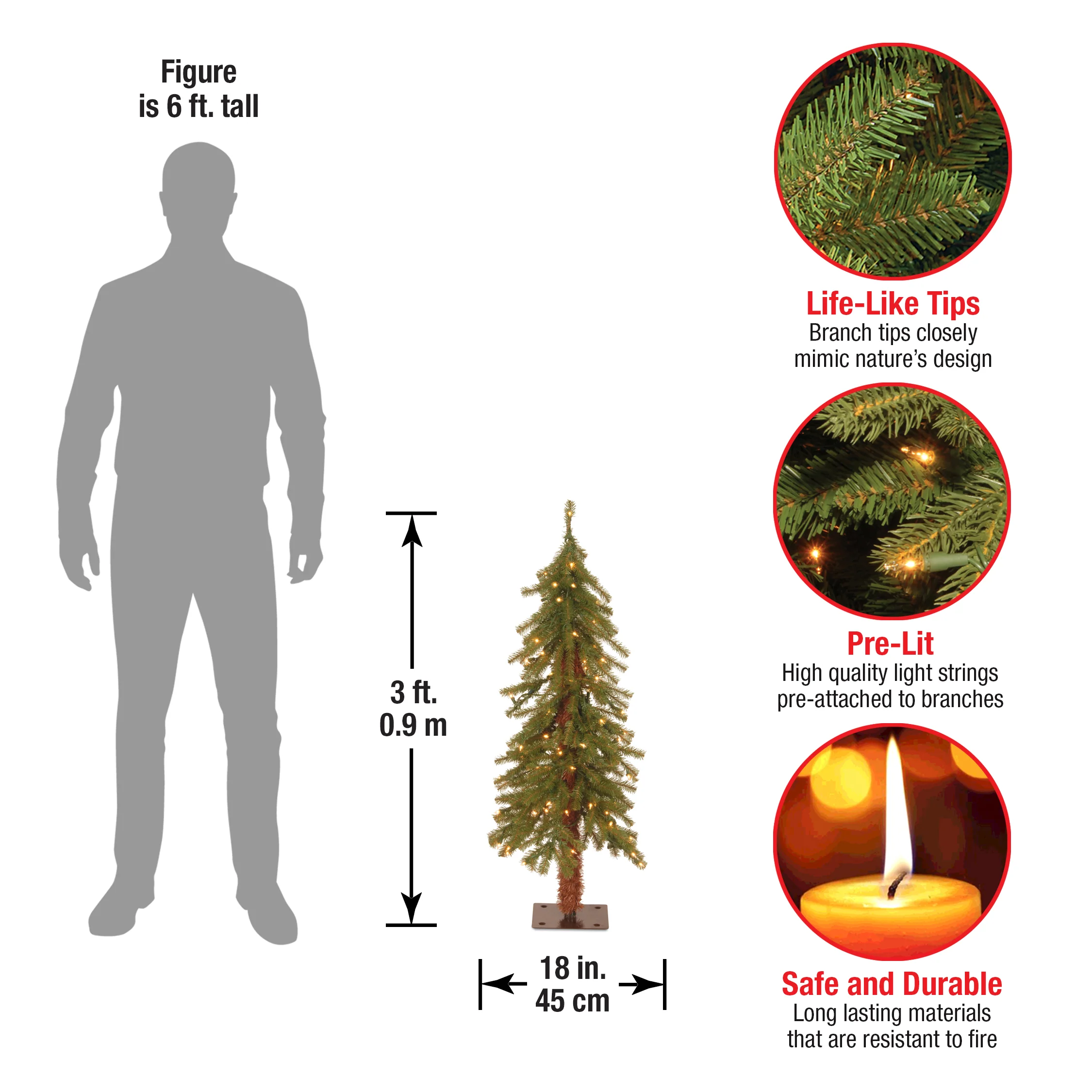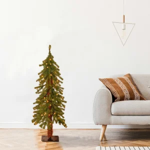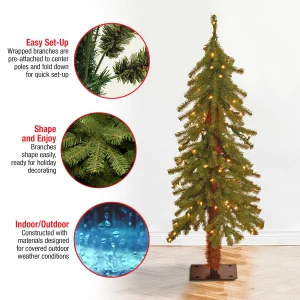 This Hickory Cedar gives the appearance of a just cut forest tree. It features a downswept branch design, wrapped center pole and steel plate base. This tree is pre-strung with 50 clear lights that remain lit even if a bulb burns out. For indoor or covered outdoor display on floor or tabletop. Plug in.