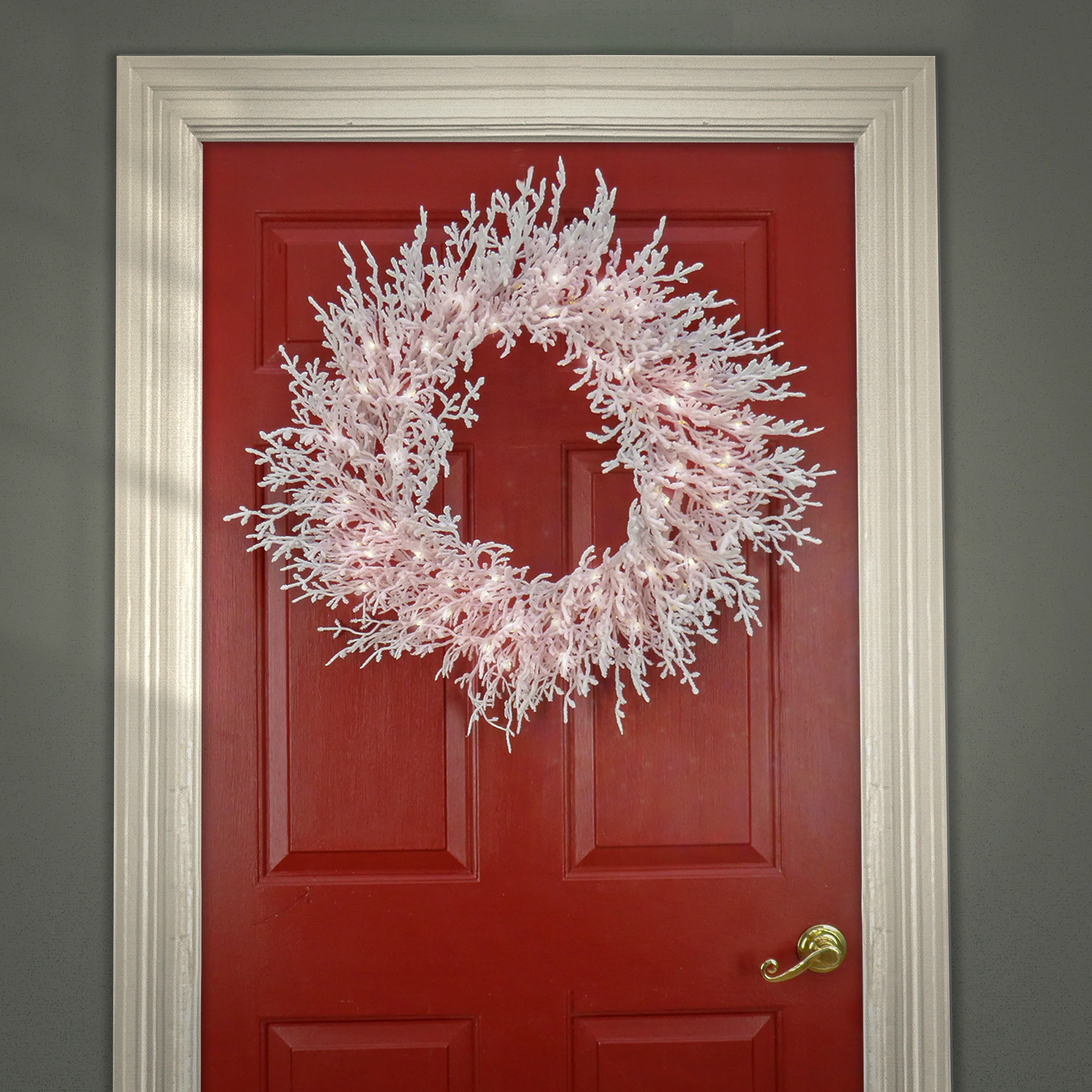 The HGTV Home Collection by National Tree Company Christmas by the Sea Coral wreath features snow flocked branches that give the appearance of soft coral tips. It is pre-lit with 100 battery operated warm white LED lights that are energy-efficient and long lasting. Inlcudes a 6 hours ON/18 hours OFF timed operation. This wreath can be displayed on door, wall, or window in indoor or covered outdoor locations.