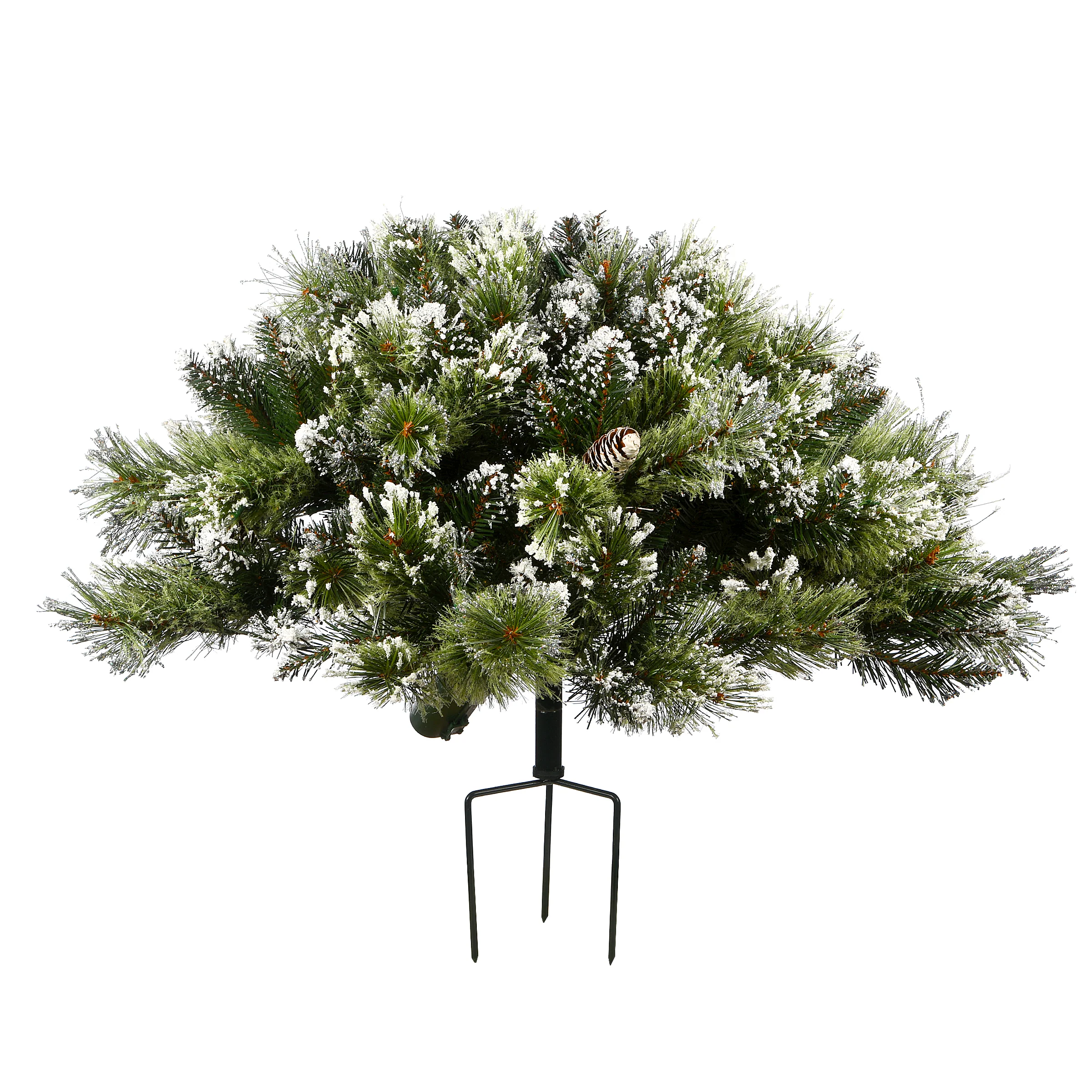 This Glittery Bristle Pine Urn Filler is designed for filling decorative urns and pots. This spray of mixed evergreen branches features silver glittered tips and is trimmed with pine cones. It is pre-lit with 100 battery operated warm white LED lights that are energy efficient and long lasting with an intergrated 6 hours ON/18 hours OFF timed operation. Included is a 3-prong metal stake for propping up the filler in an empty container or for inserting into soil. For indoor or covered outdoor display.