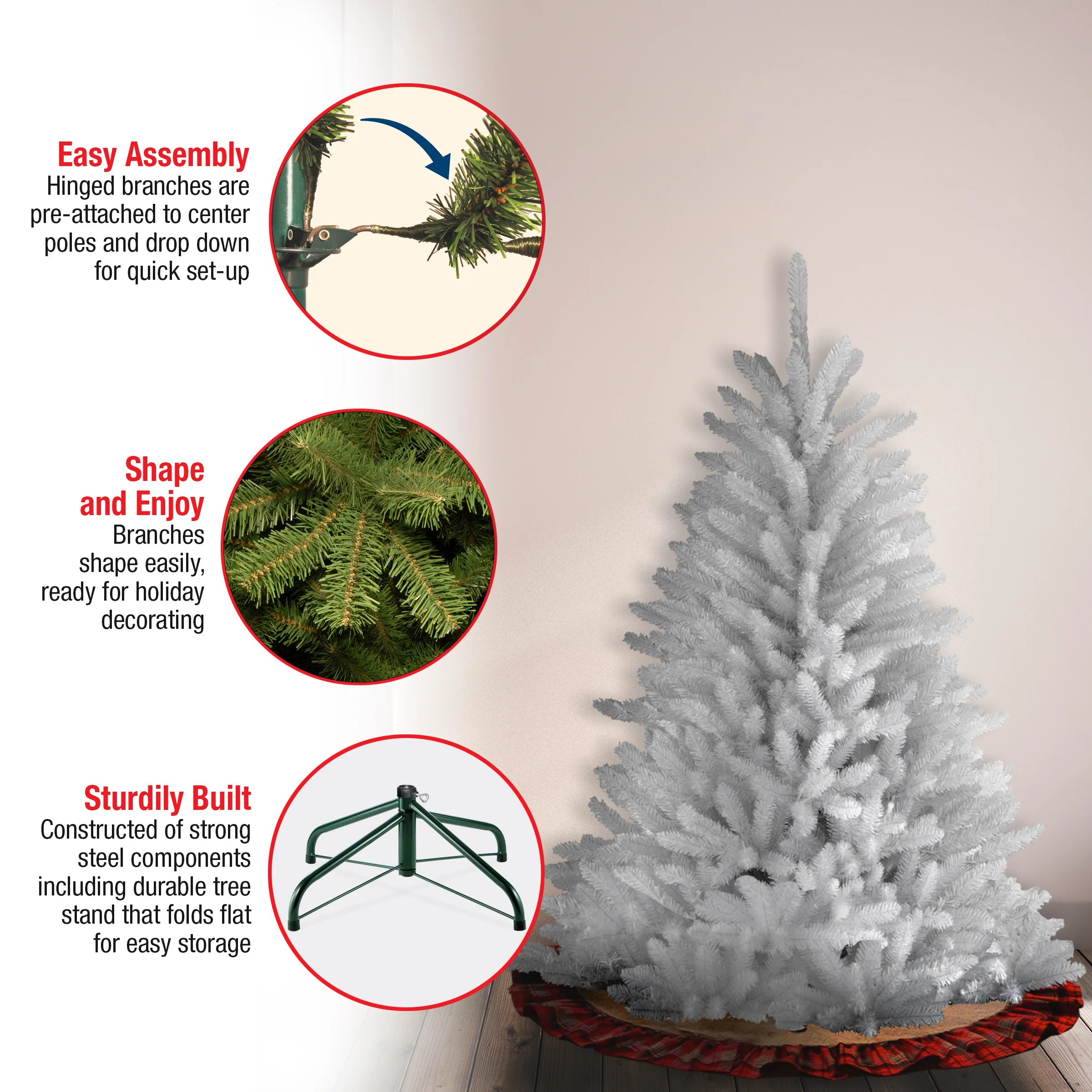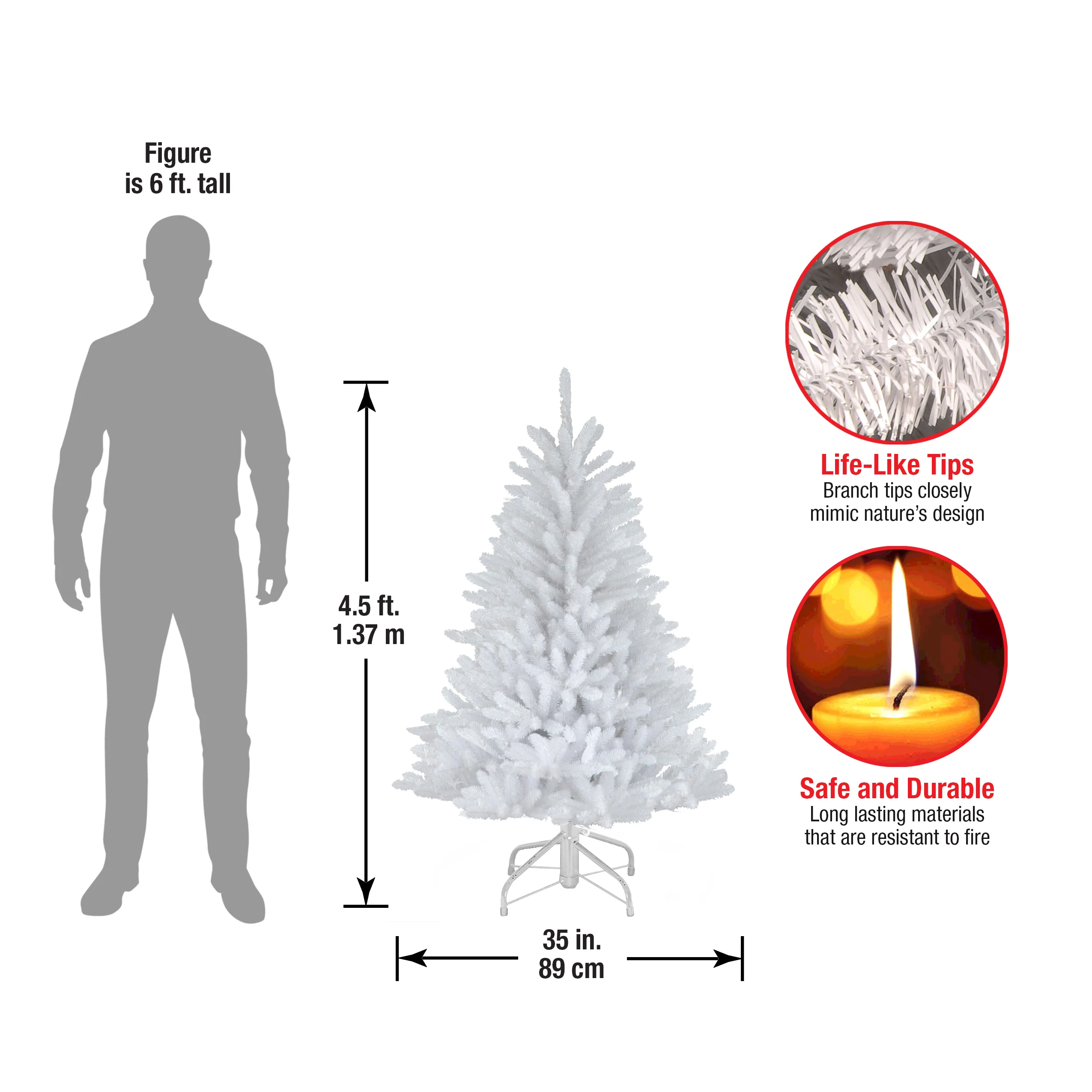 - This Dunhill Fir Full Pre-Lit Artificial White Christmas Tree is 4.5 feet tall with a 35 inch base diameter. Featuring hundreds of individually crafted branch tips to create full bodied branches, this tree is designed to look and feel lifelike.