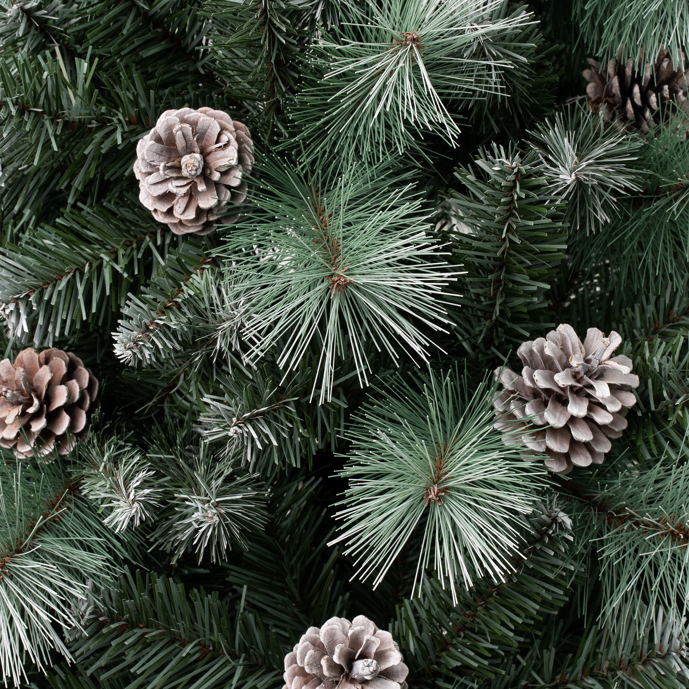 The Perry Hard Needle tree features a mix of snow-dusted evergreen and bristle branch tips and is trimmed with snow dusted pine cones. This is a full body tree featuring a generous number of branch tips for holding holiday trimmings. Crafted with high quality materials and hinged branches for easy set up and includes a sturdy metal folding stand. For indoor display only.