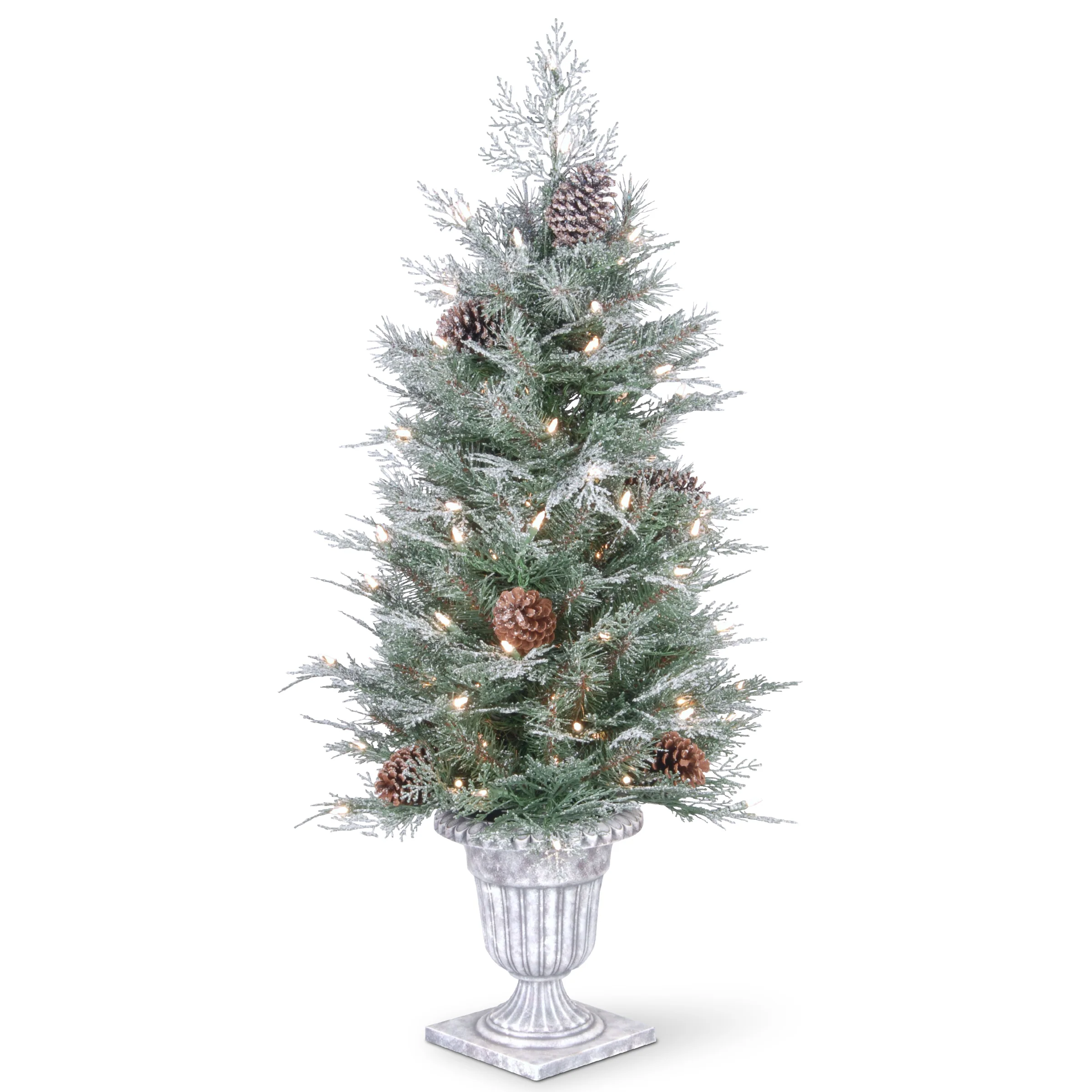 The Frosted Mountain Spruce Entrance Tree features Feel Real® branch tip technology, ensuring stunning realism with its crush-resistant branch tips molded from actual tree branches. This mixed-tip design combines lush greenery with a frosted finish, creating an inviting and festive look. It is pre-lit with 100 clear lights that remin lit even if a bulb burns out. Trimmed with pine cones and seated in a pedestal urn base, this entrance tree is perfect for welcoming guests during the holiday season. Fo rindoor or outdoor display. Plug in.