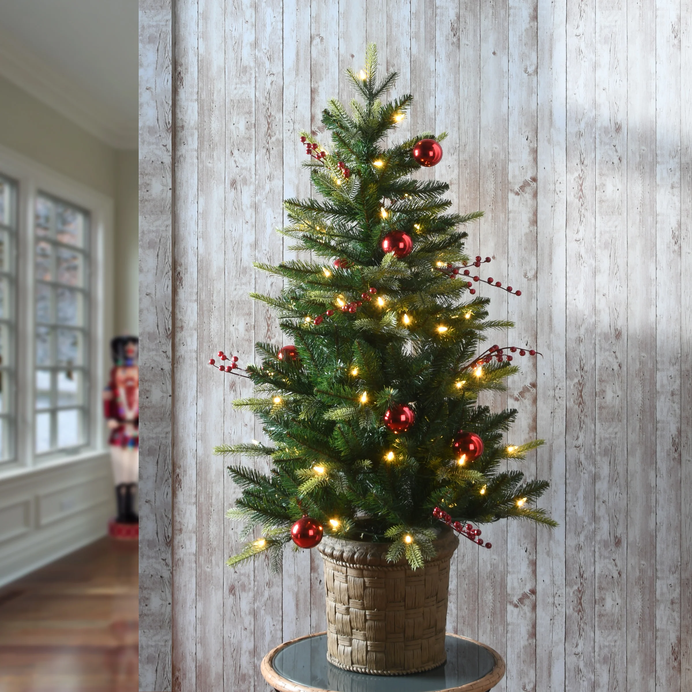 The Scotch Creek Fir features Feel Real® branch tip technology, creating a tree with remarkable realism. These crush-resistant branch tips are molded from real tree branches for an authentic living tree appearance. This attractive planting is pre-strung with 70 warm white LED lights and seated in a decorative base with basket weave design. It is trimmed with red ball ornaments and red berries for added appeal. Display in indoor or covered outdoor locations. Plug in.