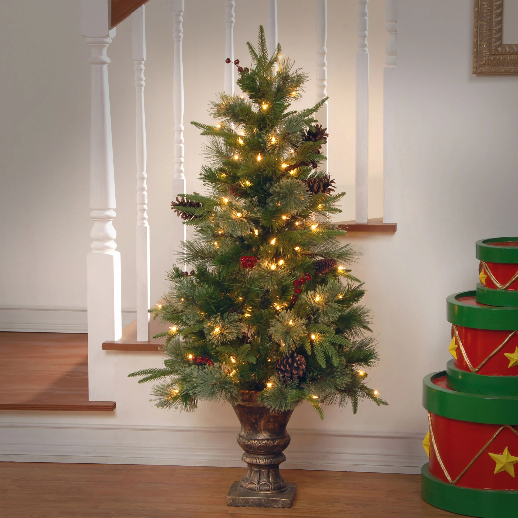 This Snowy Bristle Berry Entrance Tree features Feel Real® branch tip technology, creating a tree with remarkable realism. These crush-resistant branch tips are molded from real tree branches for an authentic living tree appearance. This mixed tip tree in decorative urn base has snow sprinkled branches and is trimmed with red berries and pine cones. It is pre-strung with 100 clear lights that remain lit even if a bulb burns out. Display in indoor or covered outdoor locations including doorways, deck, porch or patio. Plug in.