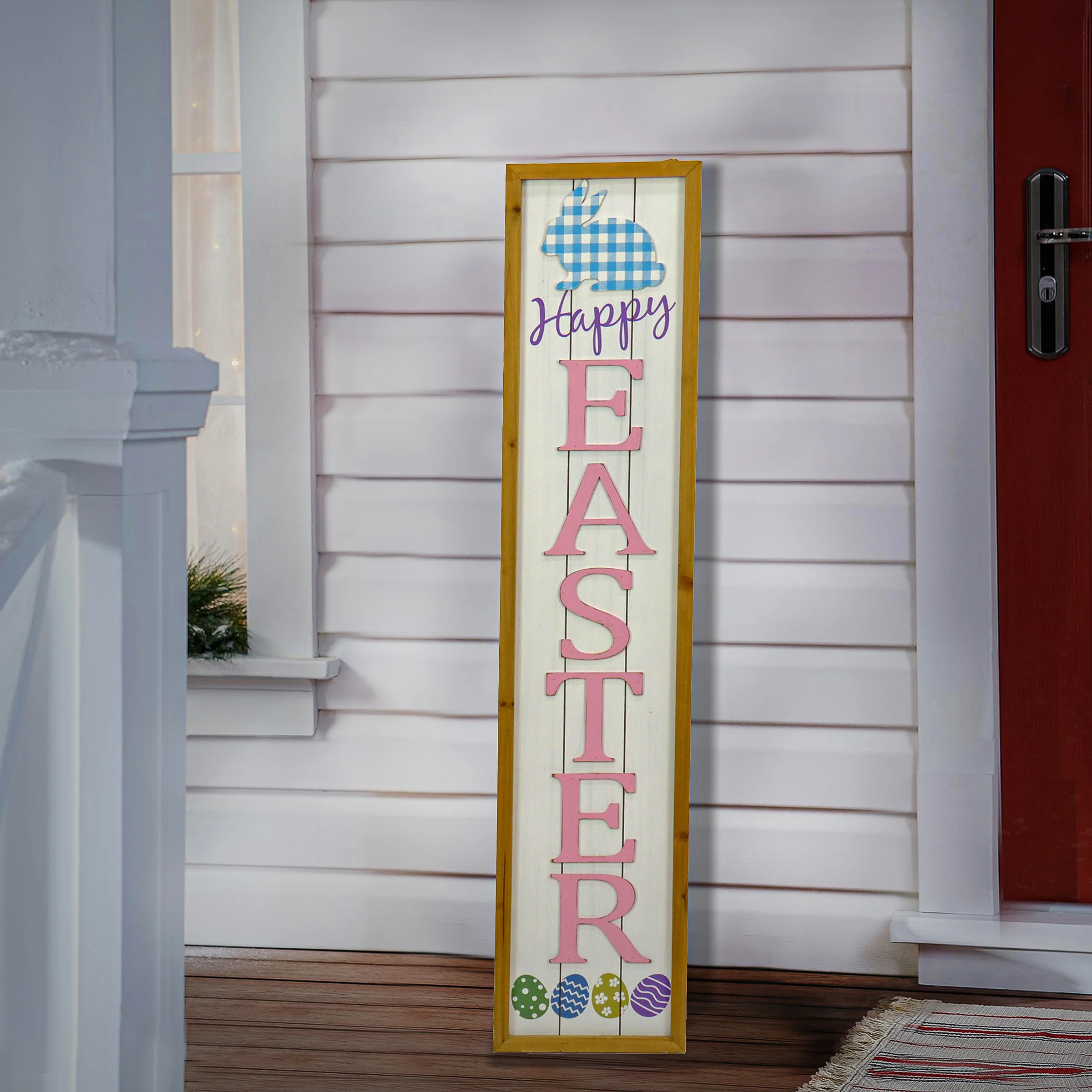 - This porch decoration features a script lettered Happy above a bright pink lettered Easter with added bunny and colored egg trimmings