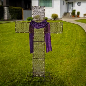 - This pre-lit cross decoration is decorated with a purple glittered cloth wrap to drape the cross, as well as a sturdy, square base