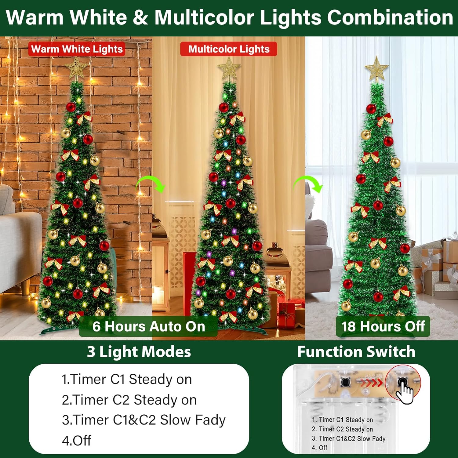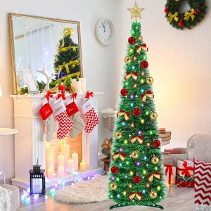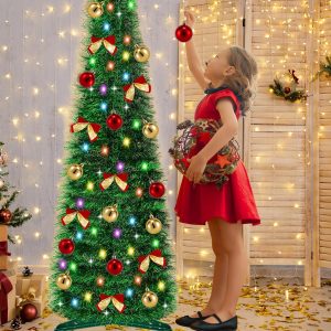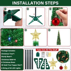 5 Ft Pop Up Pencil Christmas Tree with Timer 60 Warm White & Multicolor Change Lights, Pop Up Tinsel Christmas Tree with 16 Ball Ornaments 8 Bows 1 Minute Xmas Tree Home Indoor Christmas Decorations