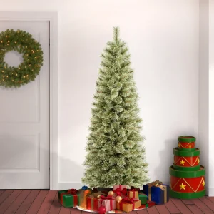 The Arcadia Pine Cashmere Christmas Tree is a slim profile tree that is a great choice for display in corners, small rooms or areas with limited floor space. It features a generous number of branch tips for holding holiday trimmings. This tree features hinged branch construction for ease of assembly. Sturdy folding metal tree stand is included.