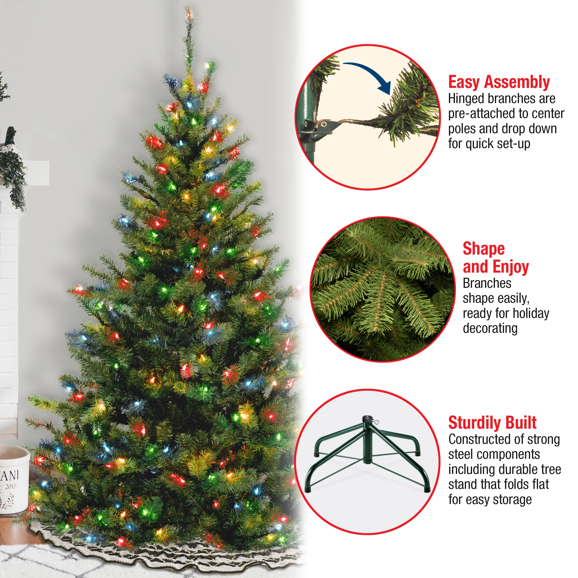The Kincaid Spruce presents a classic shape evergreen tree with wide diameter branch tips for added fullness. It is pre-strung with 400 multicolor lights that remain lit even if a bulb burns out. This tree features wrapped branch construction for ease of assembly. Sturdy folding metal tree stand is included. Plug in.