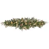 This Swiss Chic decorated mantle swag features a mixture of evergreen and bristle branch tips tightly grouped together to form this holiday décor piece. It is trimmed with pinecones, leafy greens, white twigs, clusters of blue berries and gold metal bells. A black velvet ribbon and bow add the finishing touch. Display this festive swag over a fireplace mantle or on a tabletop. For indoor use only.
