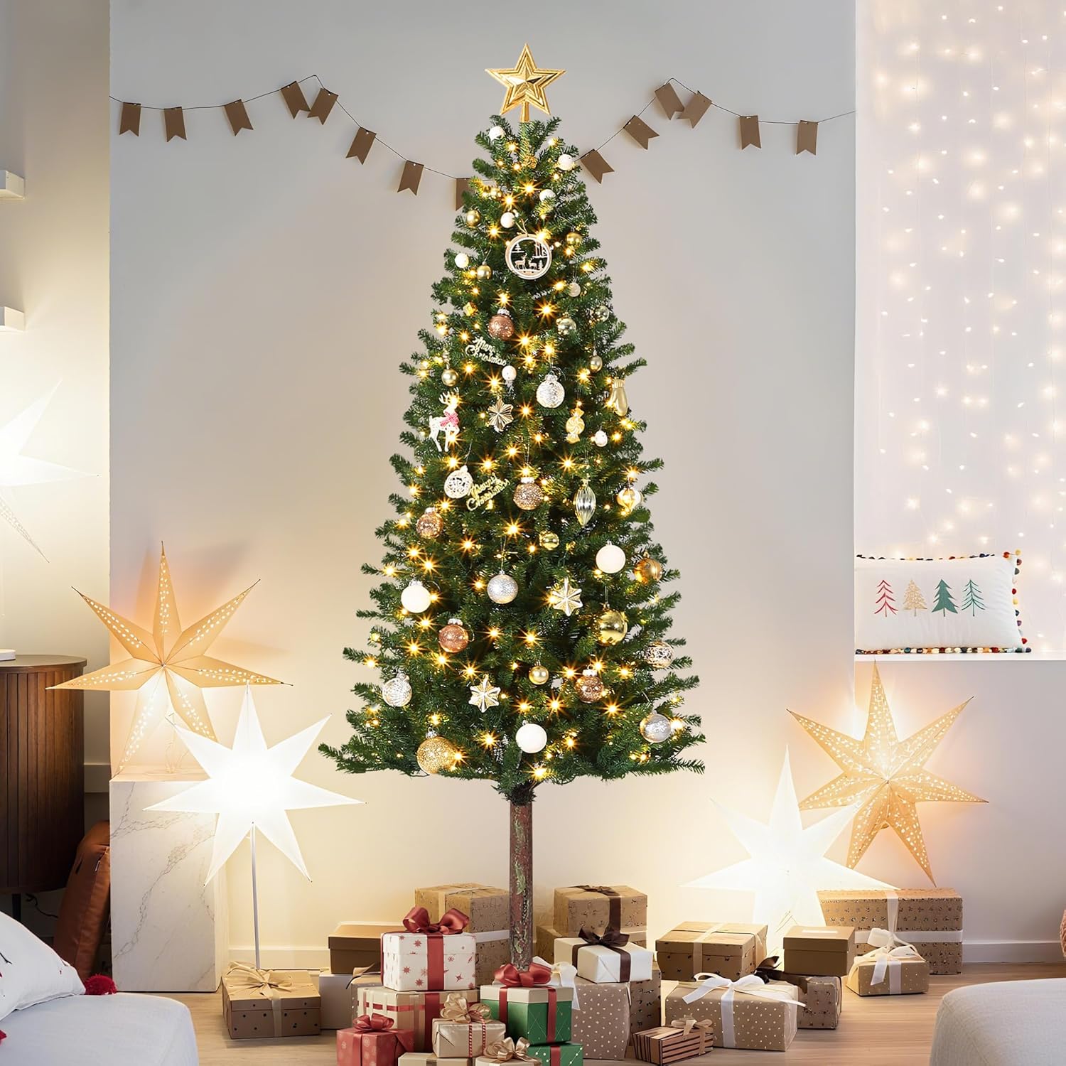 - Warm Glow: This Christmas fir tree has ample incandescent warm white lights, creating a cozy and festive ambiance and spreading the brilliant glow and cheerful warmth to all the guests.