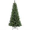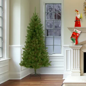 This Canadian Grande features a traditional cone shape and a slimmer profile compared to trees of similar height. This design makes it a good choice for display in areas with limited floor space or in secondary rooms. This three section tree features hinged branches for assembly ease. Sturdy folding metal tree stand is included.