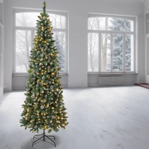 This Oakley Hill Snow tree features flocked branches and pinecones giving the appearance of freshly fallen snow. It is pre-strung with 350 warm white LED lights that remain lit even if a bulb burns out. The slim profile of this tree may be a better fit for corners or areas with limited floor space. This tree features hinged branches for ease of assembly. Sturdy folding metal tree stand is included. Plug in.