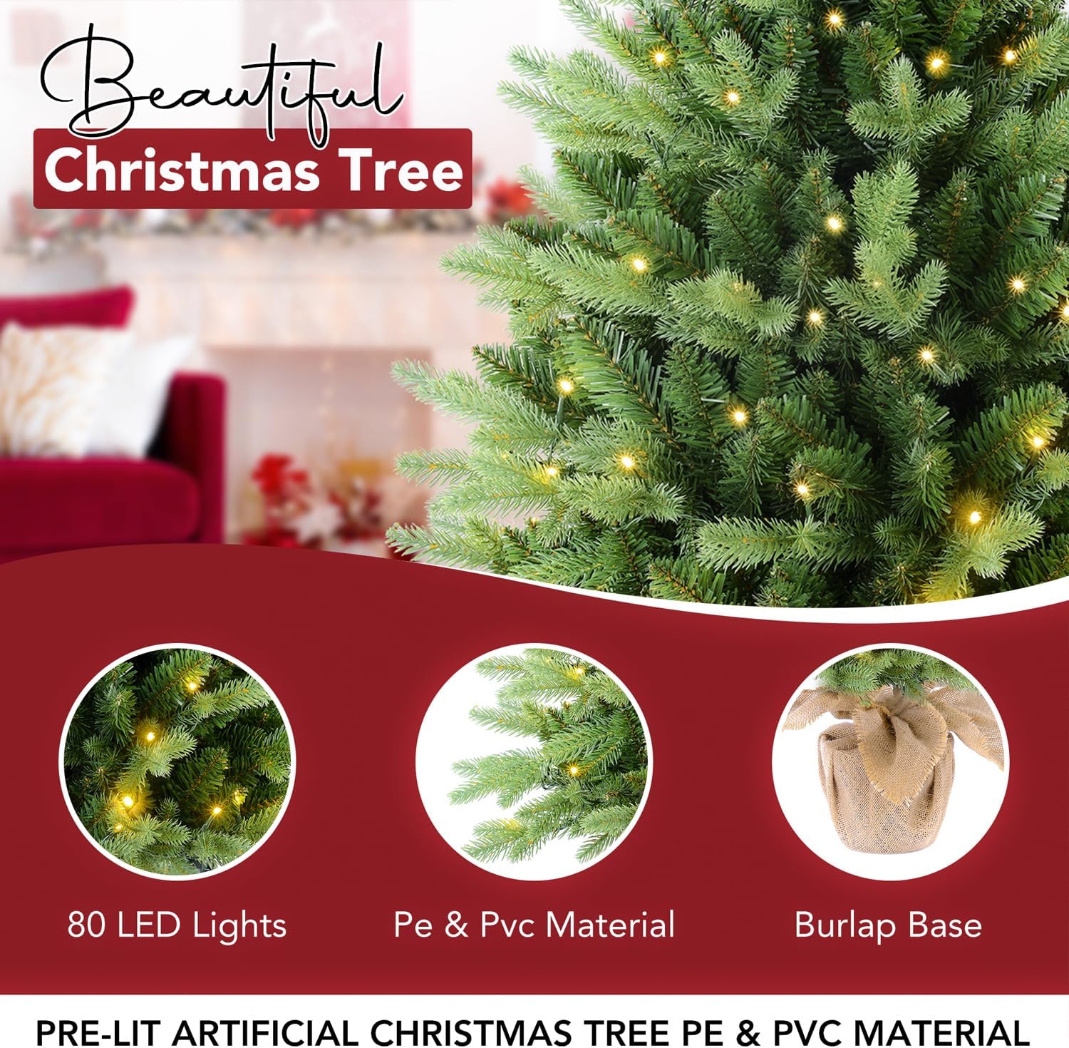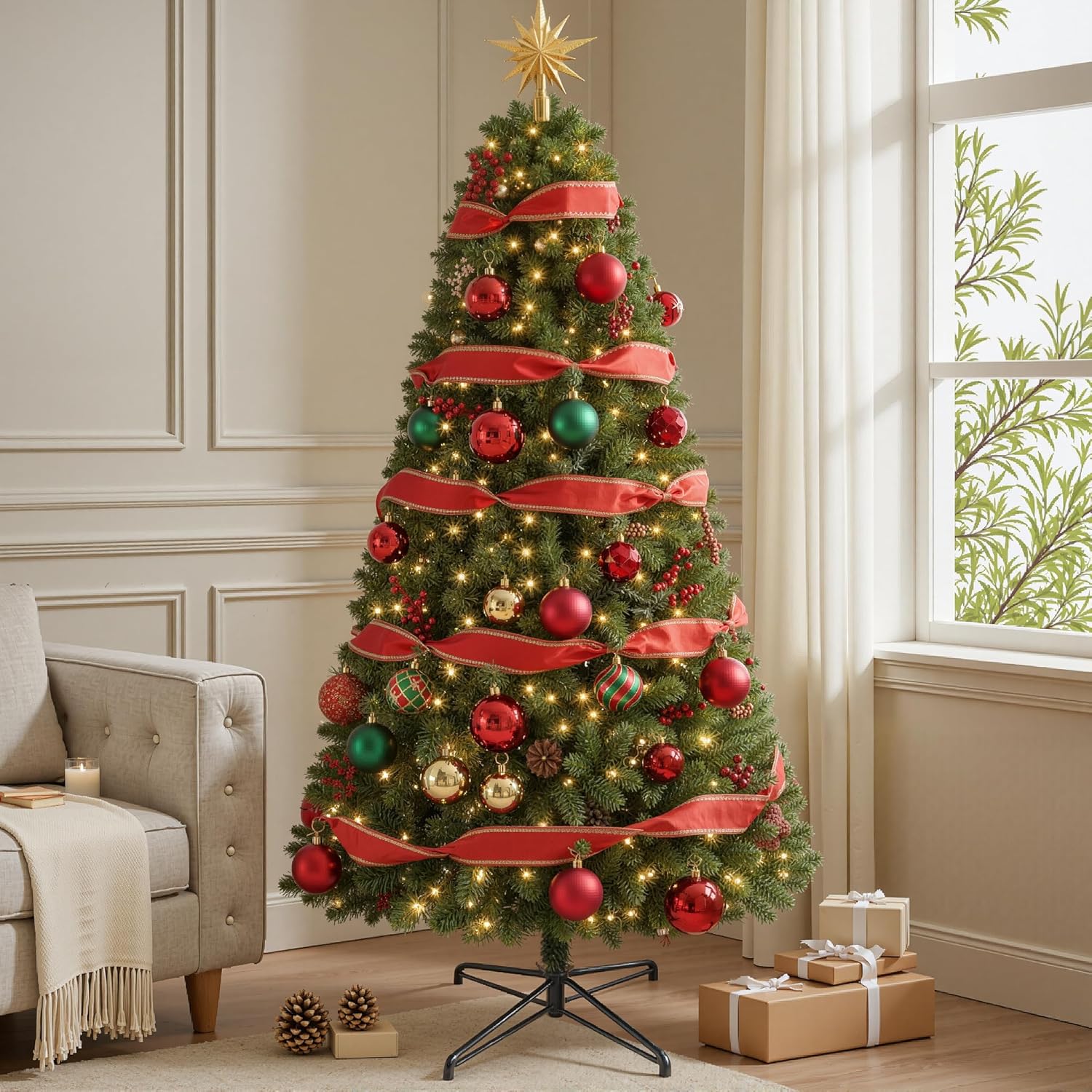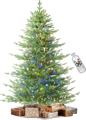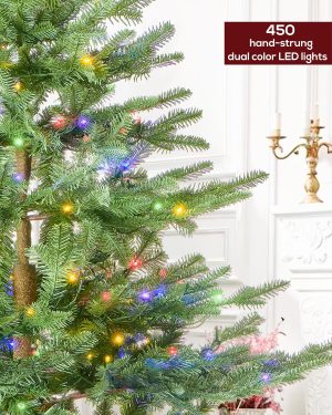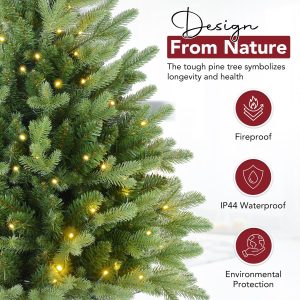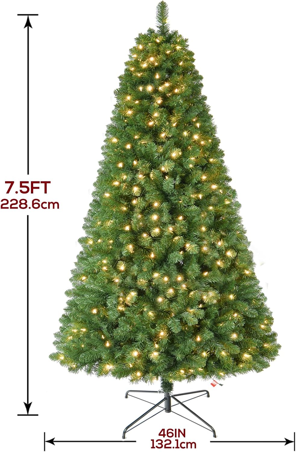 7.5 FT Prelit Christmas Tree, Artificial Spruce Christmas Tree with 350 Warm White LED Lights, 1100 PVC Branch Tips, Easy Assembly/Metal Stand/Hinged Branches Decoration