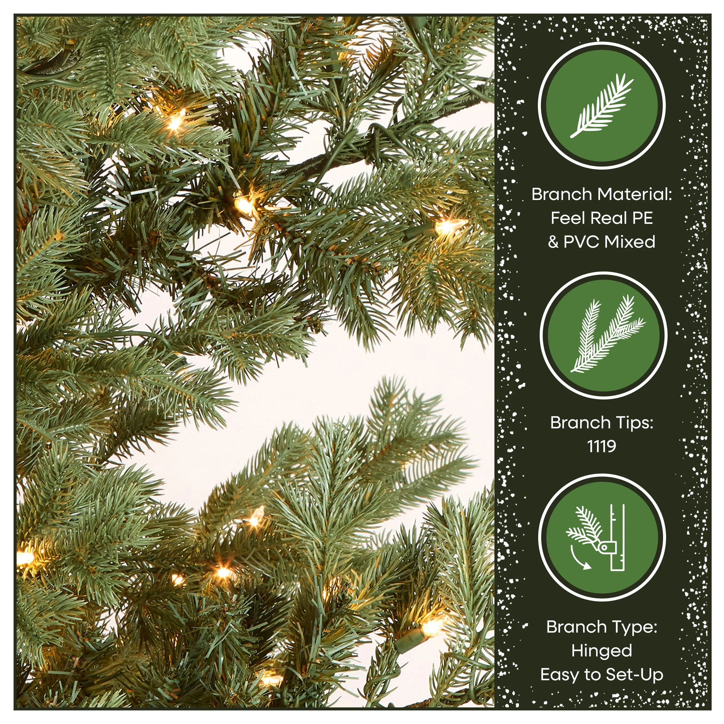 - LIFELIKE PRELIT CHRISTMAS TREE: 9 foot artificial tree with 32” base features 1,119 realistic PE Feel Real® and PVC branch tips for a lush, full appearance that elevates holiday décor