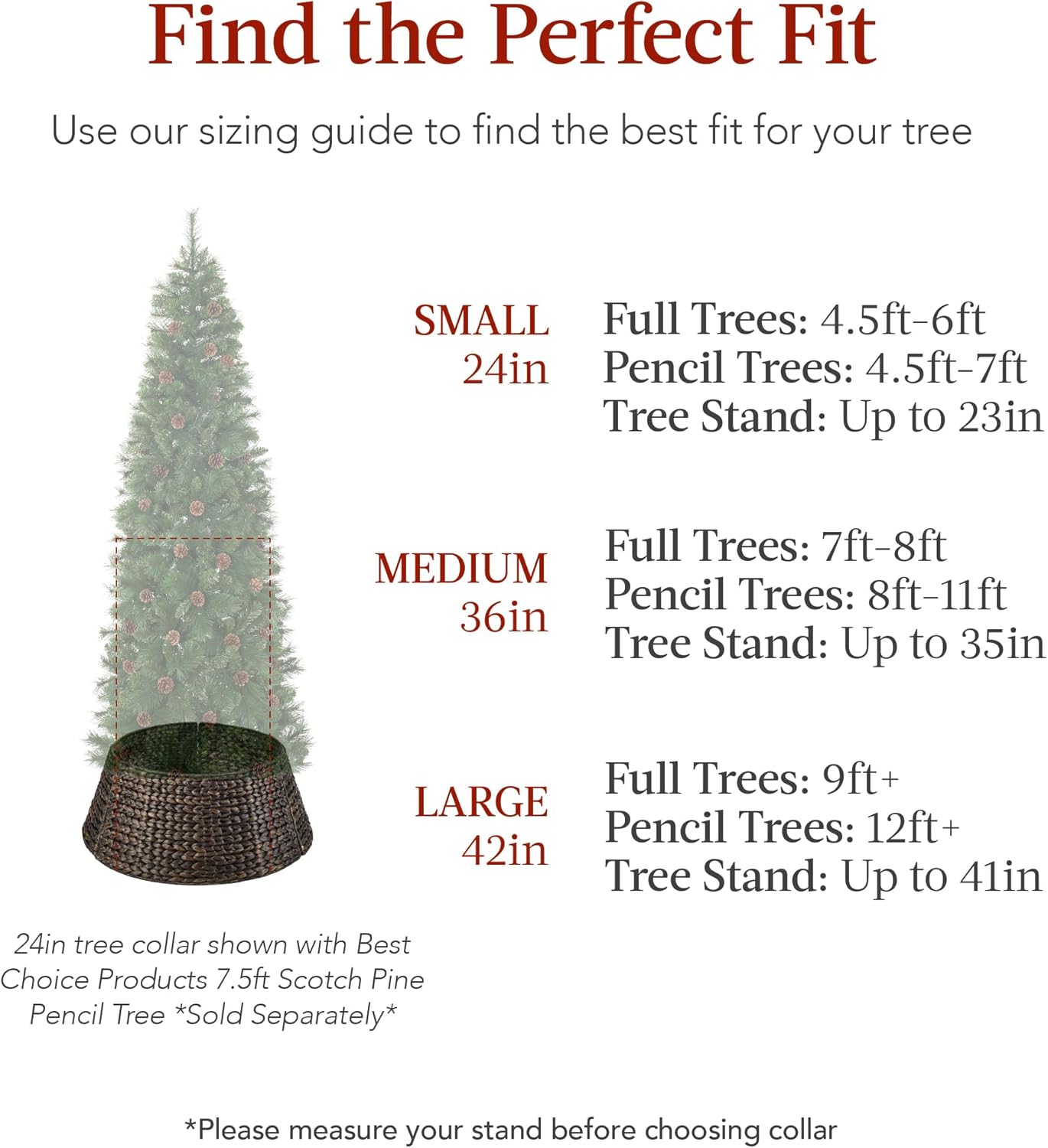 - ONE SIZE FITS MANY: Use our sizing chart to determine which tree collar will best fit your tree-suitable for pencil trees, sparse trees, and more! Sizing: (24″/36″/42″) 4ft-6ft Trees or 23″ Stand/ 7.5ft trees or 35″ Stand/ 9ft+ or up to 41″ Stand