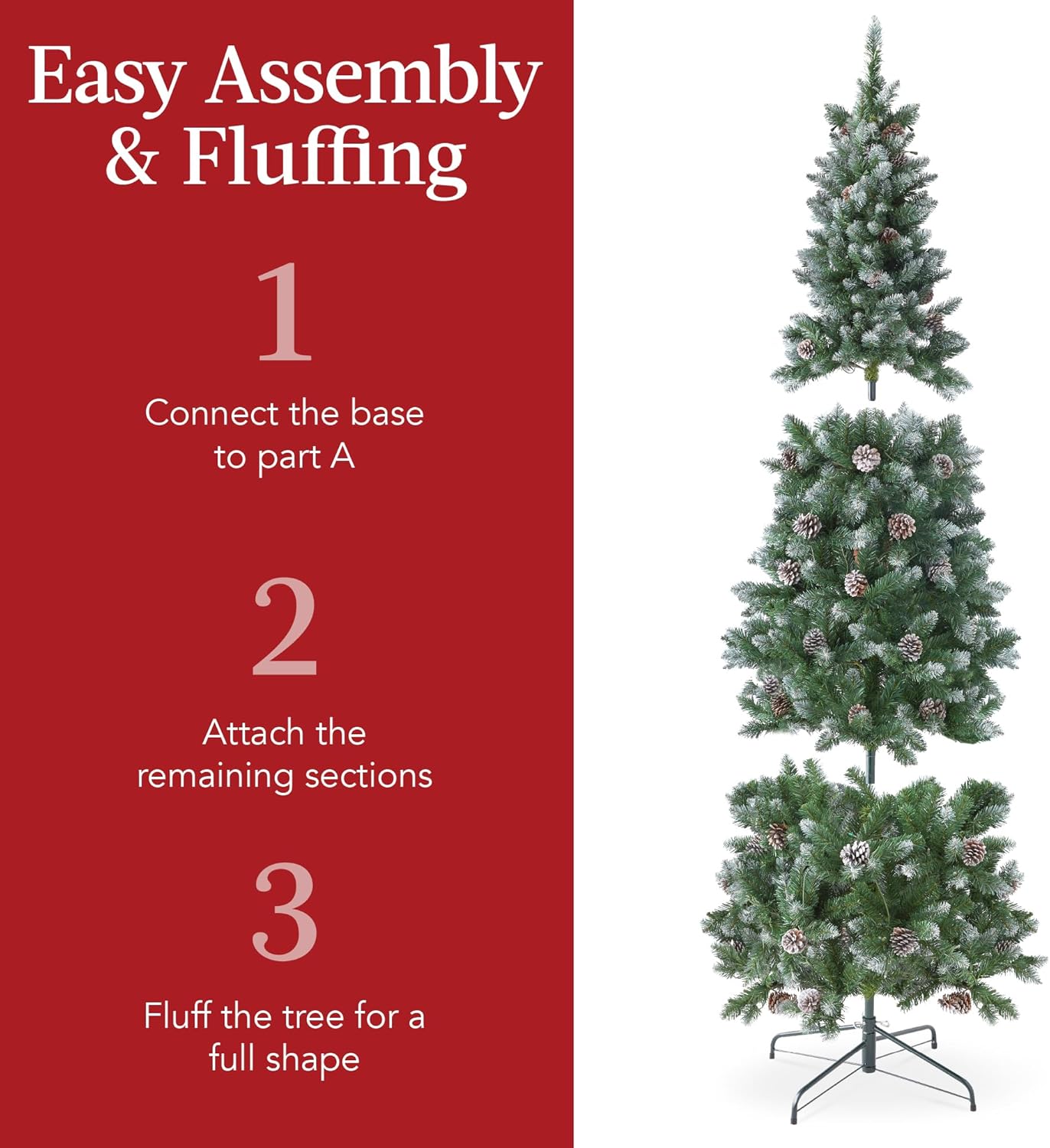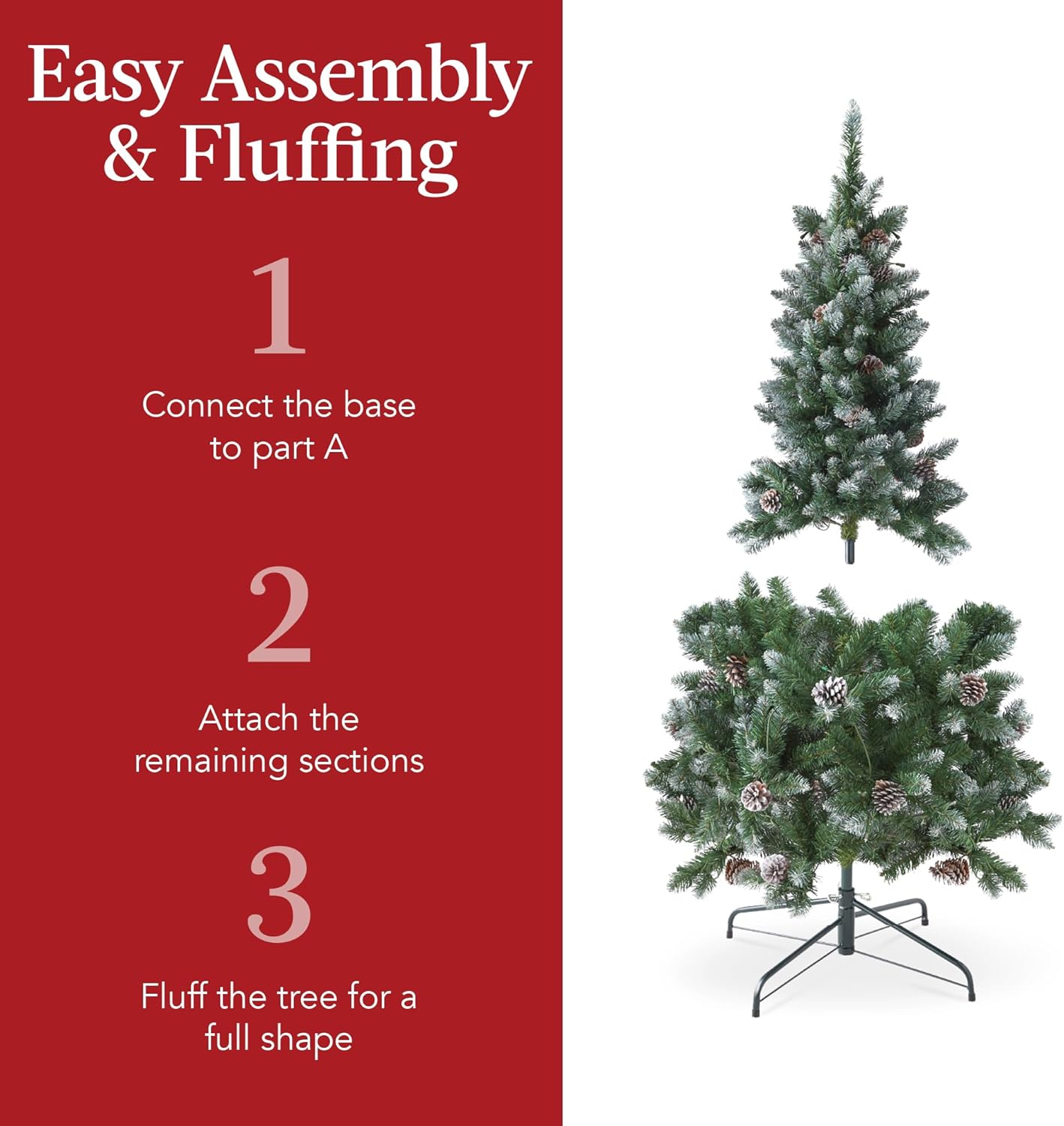 - EASY ASSEMBLY & FLUFFING: Each tree comes in multiple tiers (3-5) for easy fluffing and a simple tab and slot system with electrical plugs for a quick, straightforward assembly; OVERALL DIMENSIONS: 27.5″(Dia) x 72″(H)