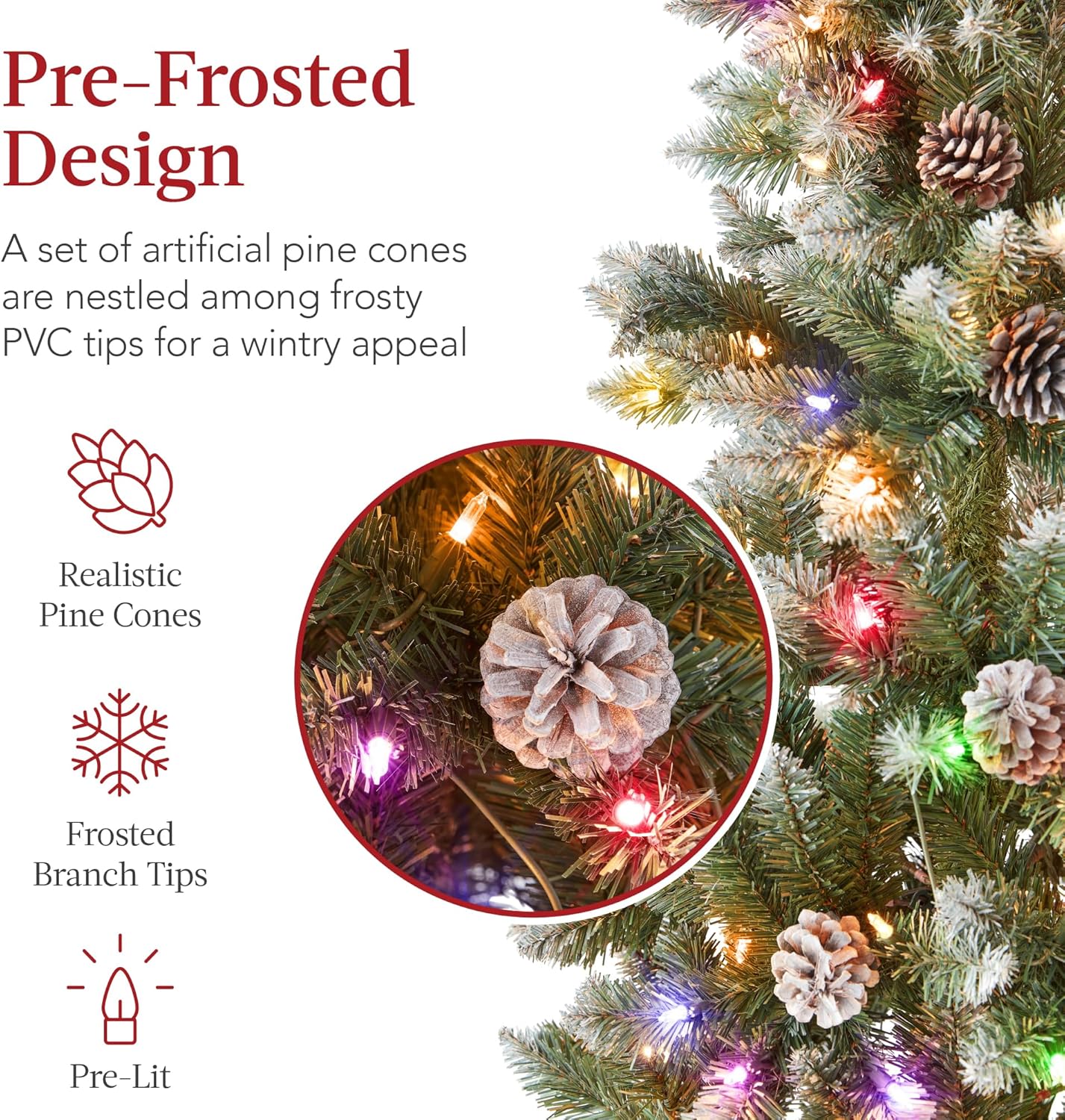 - PRE-FROSTED DESIGN: Flexible PVC branches are partially flocked and covered with artificial pinecones to turn any space into a winter wonderland!