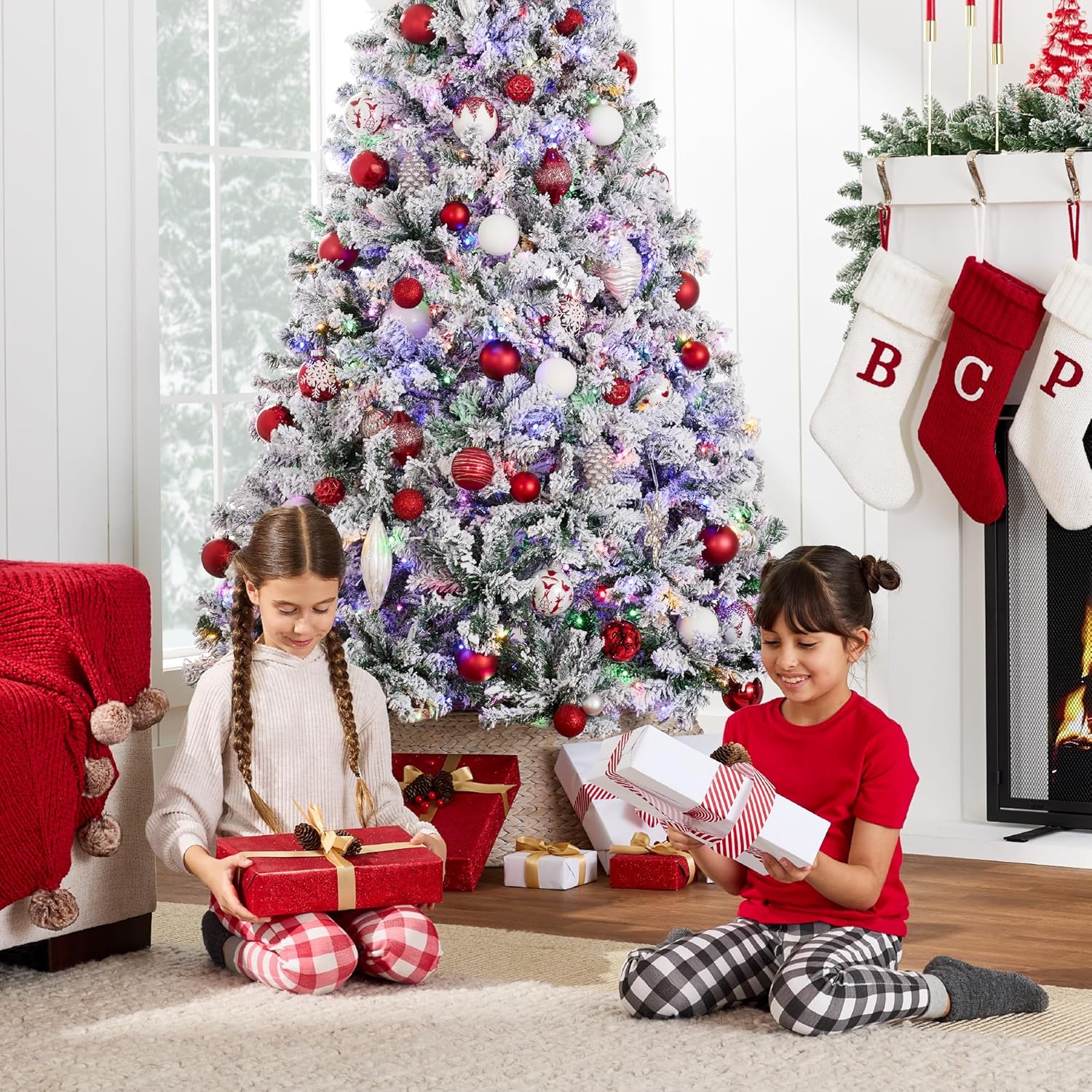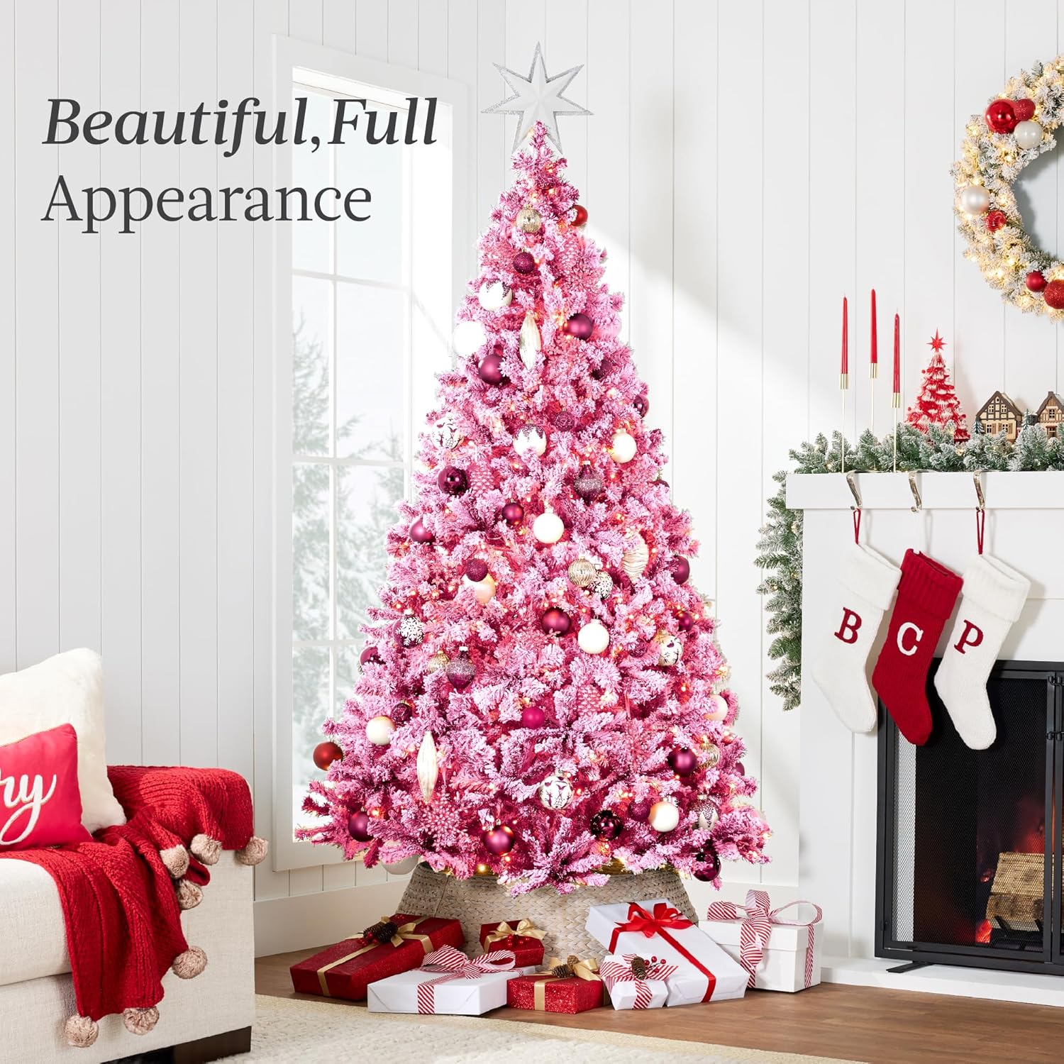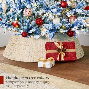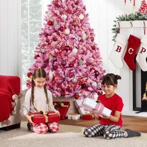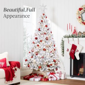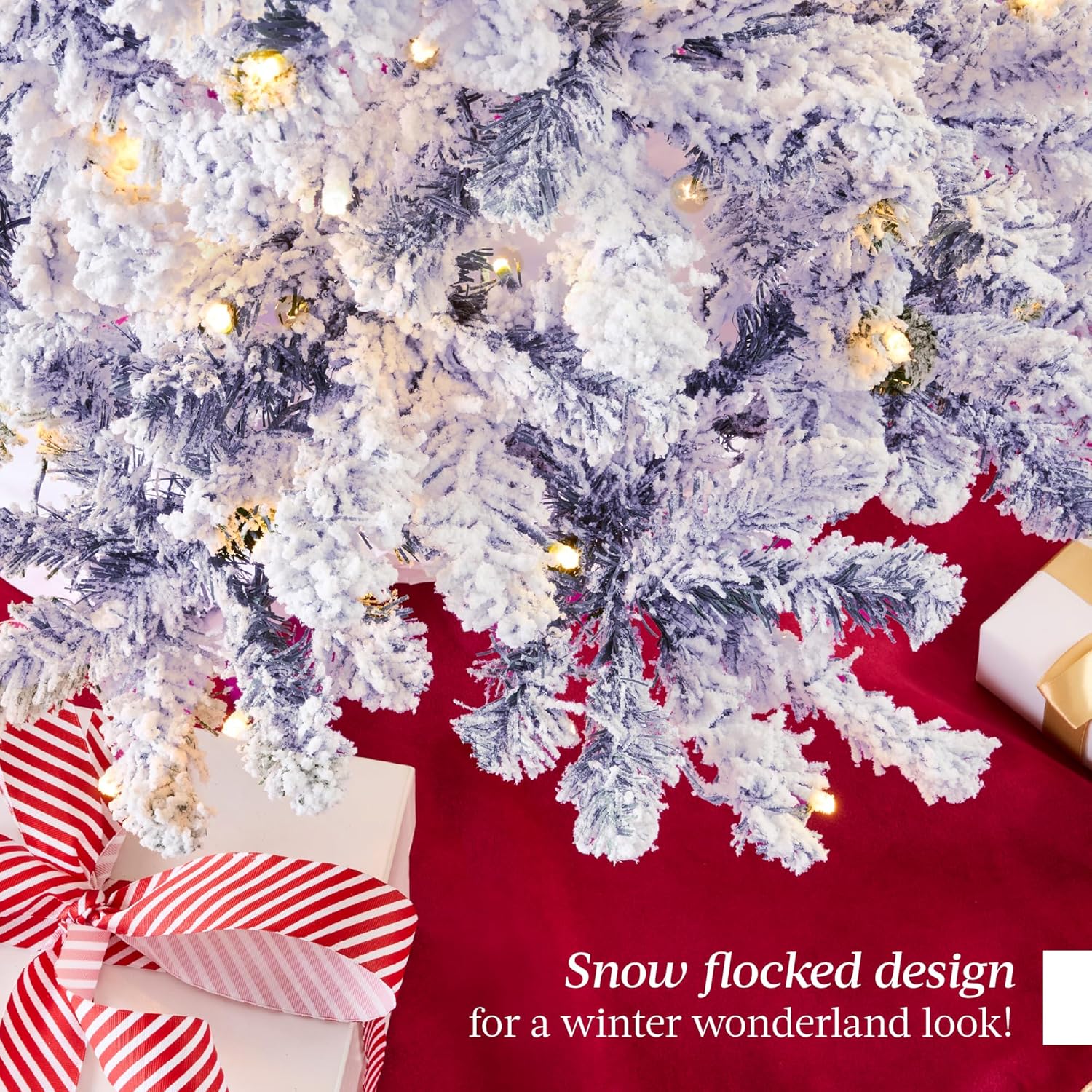 - PRE-FLOCKED CHRISTMAS TREE: Experience a white Christmas as the all black PVC pine needles are beautifully enhanced by a snow-flocked finish, transforming your home or office space into a winter wonderland!