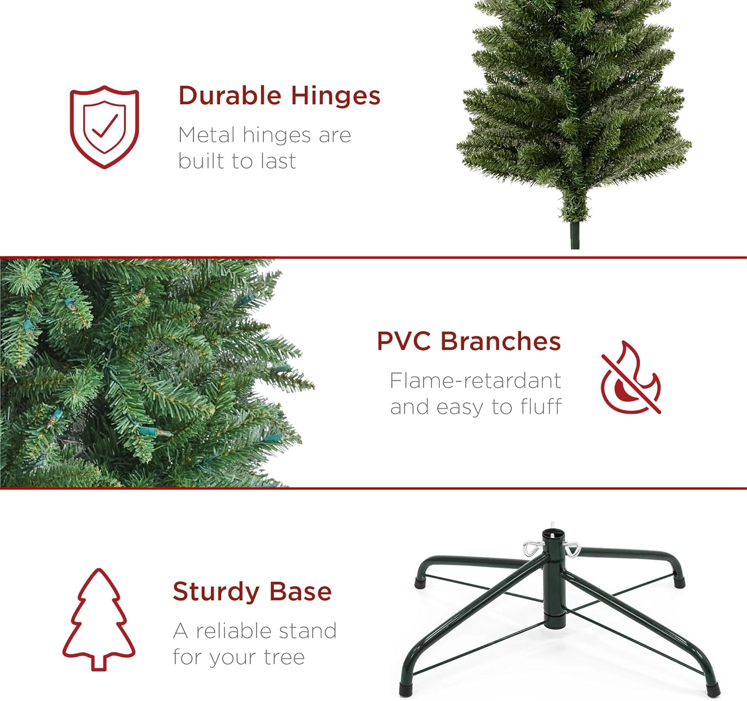 - HIGH-QUALITY MATERIALS: Crafted with durable metal hinges and flame-retardant PVC branches that stand tall with the help of a sturdy metal base, so your tree is ready to look its best for the season ahead!; OVERALL DIMENSIONS: 32.5″(Dia) x 90″(H)