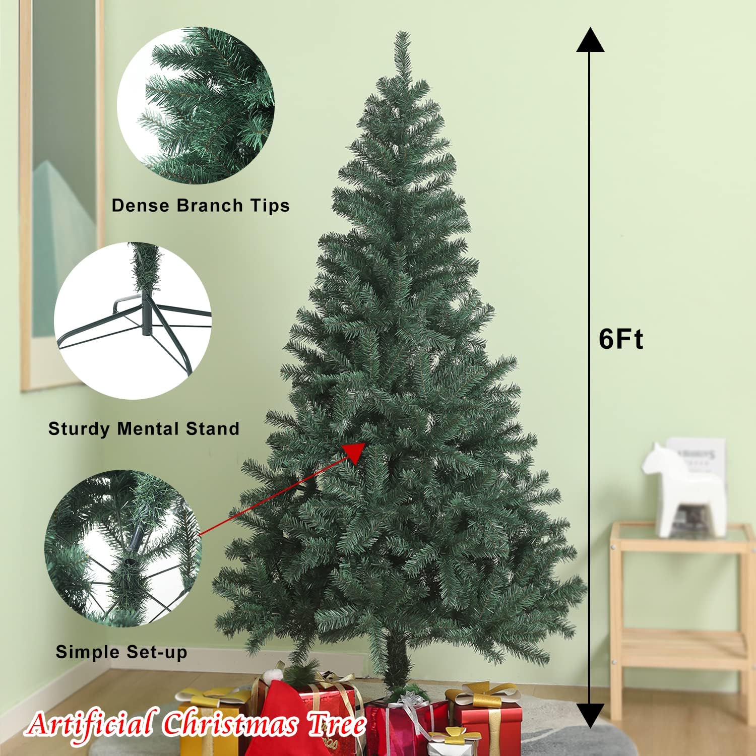 - Size: this artificial Christmas tree measure 6 feet in height and 2.6 feet in diameter. A really thick, bushy tree for value when you open all the branches according our instructions. Perfect size for Christmas home decoration.