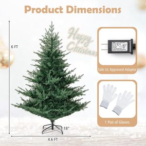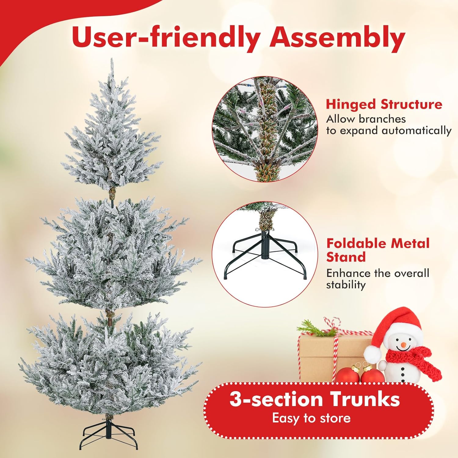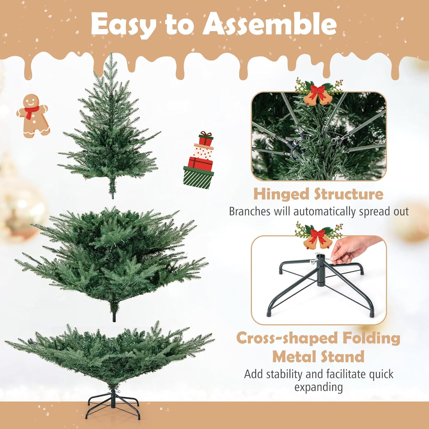 - Hassle-free Setup & Storage: The hinged structure allows the branches to auto spread out, saving you time and effort during setup. Additionally, the full Christmas tree's 4-section design enables compact storage once the holiday season is over. As a bonus, we provide a pair of gloves to ensure pleasant assembly.