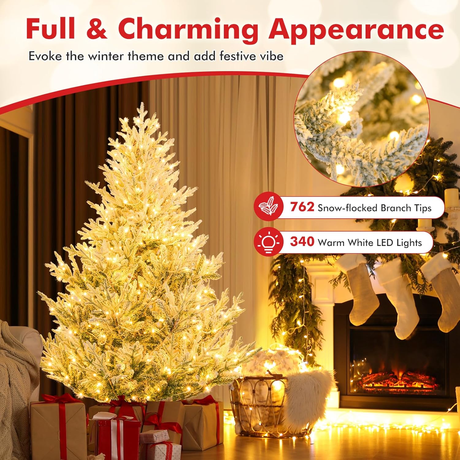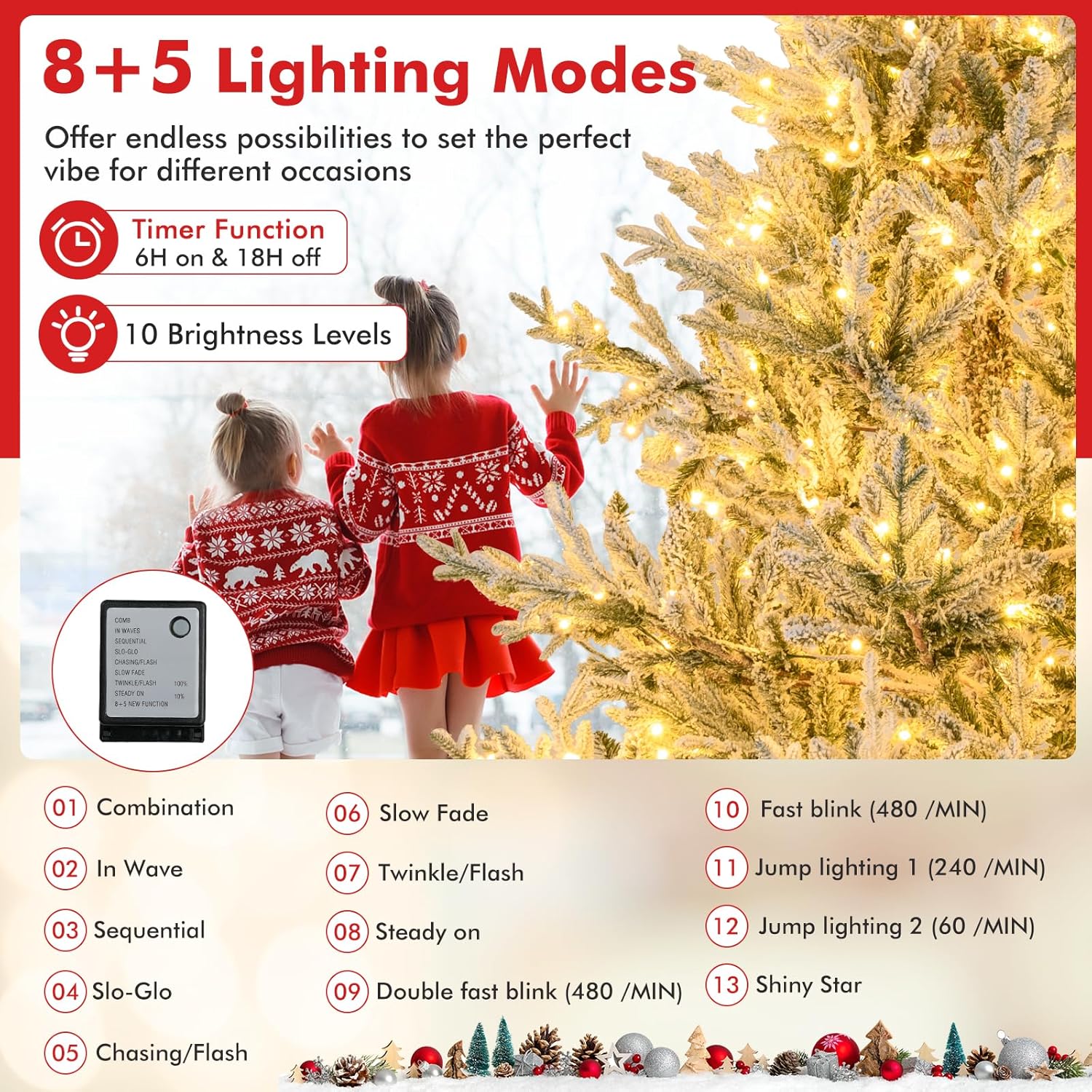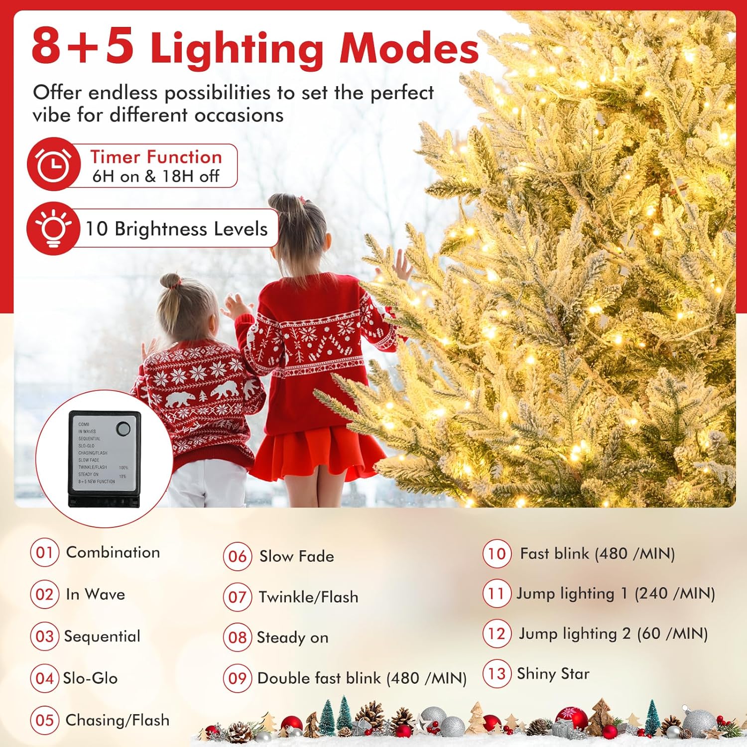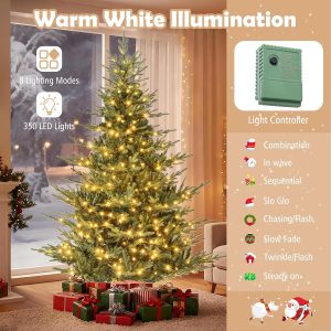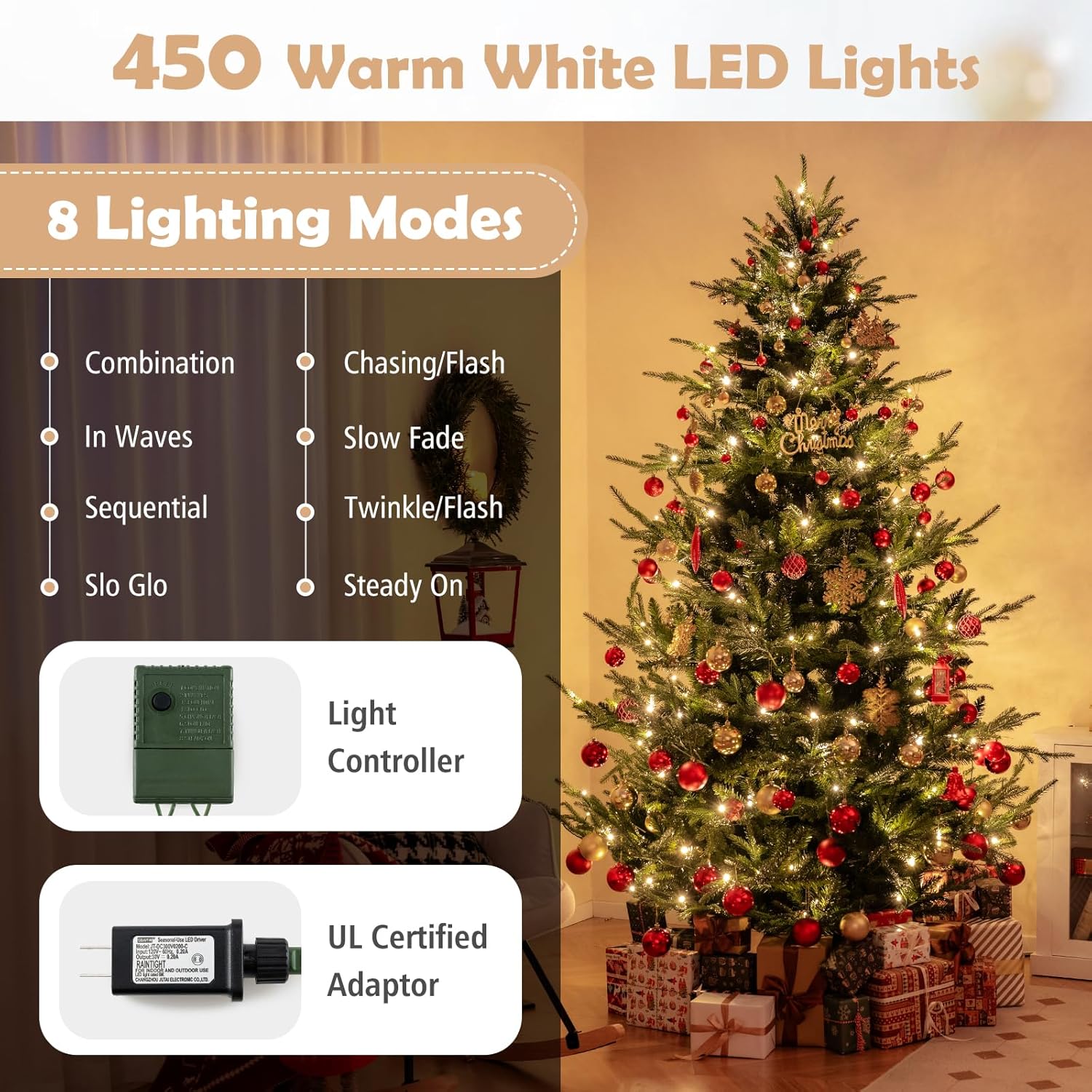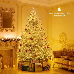 - Adjustable Lighting Modes: Adorned with 450 LED lights that emit warm-white lighting, the pre-lit Xmas tree adds a delightful ambiance to your living space. With 8 dynamic lighting modes to choose, you can customize your lighting display and create a mesmerizing holiday show.