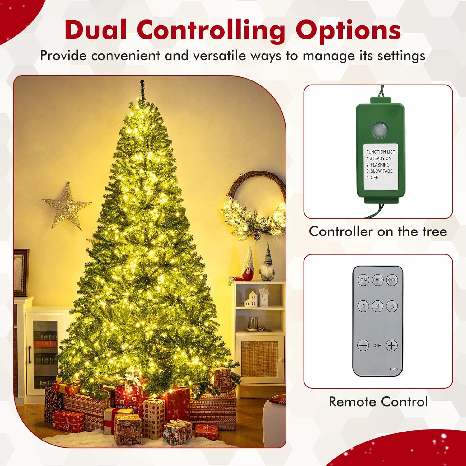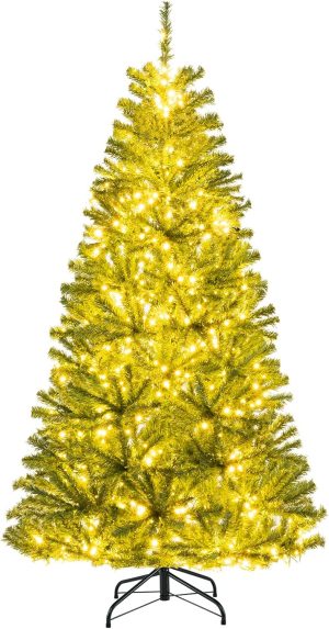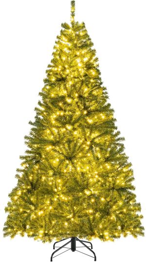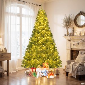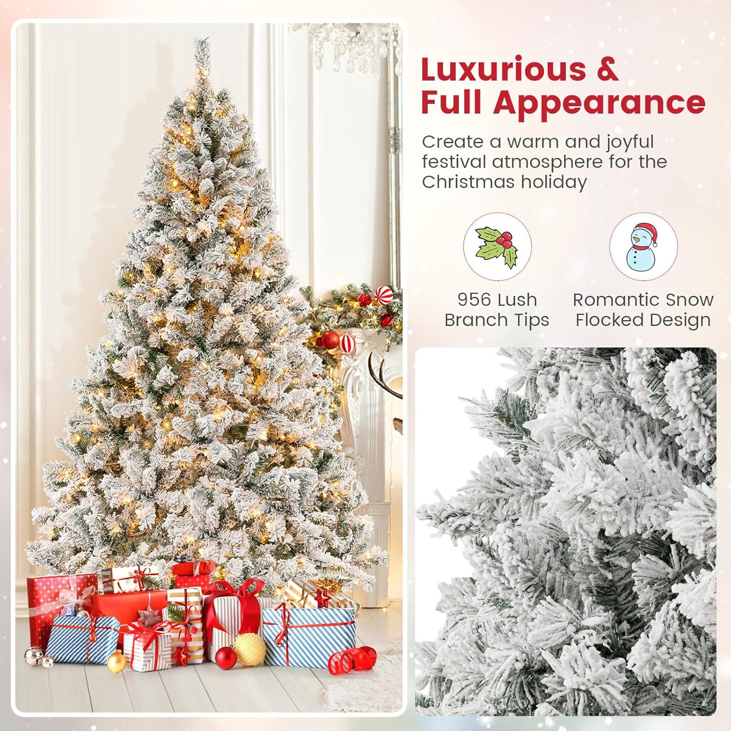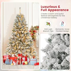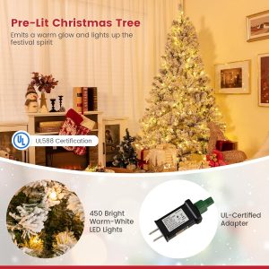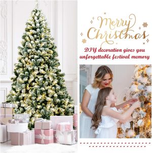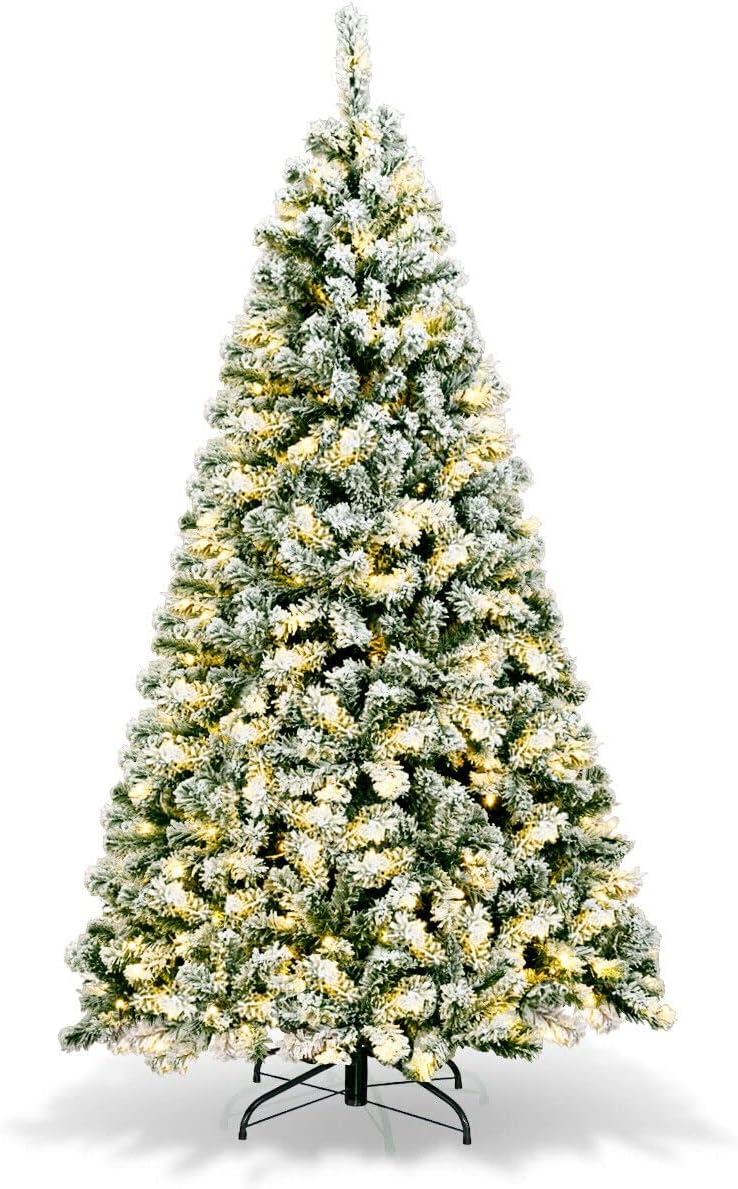 - 🎄Full-body Pre-lit Snow Flocked Xmas Tree: Crafted with 1346 branch tips and snow flocked leaves, this 7.5FT Christmas tree is leafy and elegant. It will create a unique wintry feel, leaving you with the sensation that it is a real tree. In addition, this Xmas tree is equipped with 550 warm LED lights that will bring a festival glow to your home.