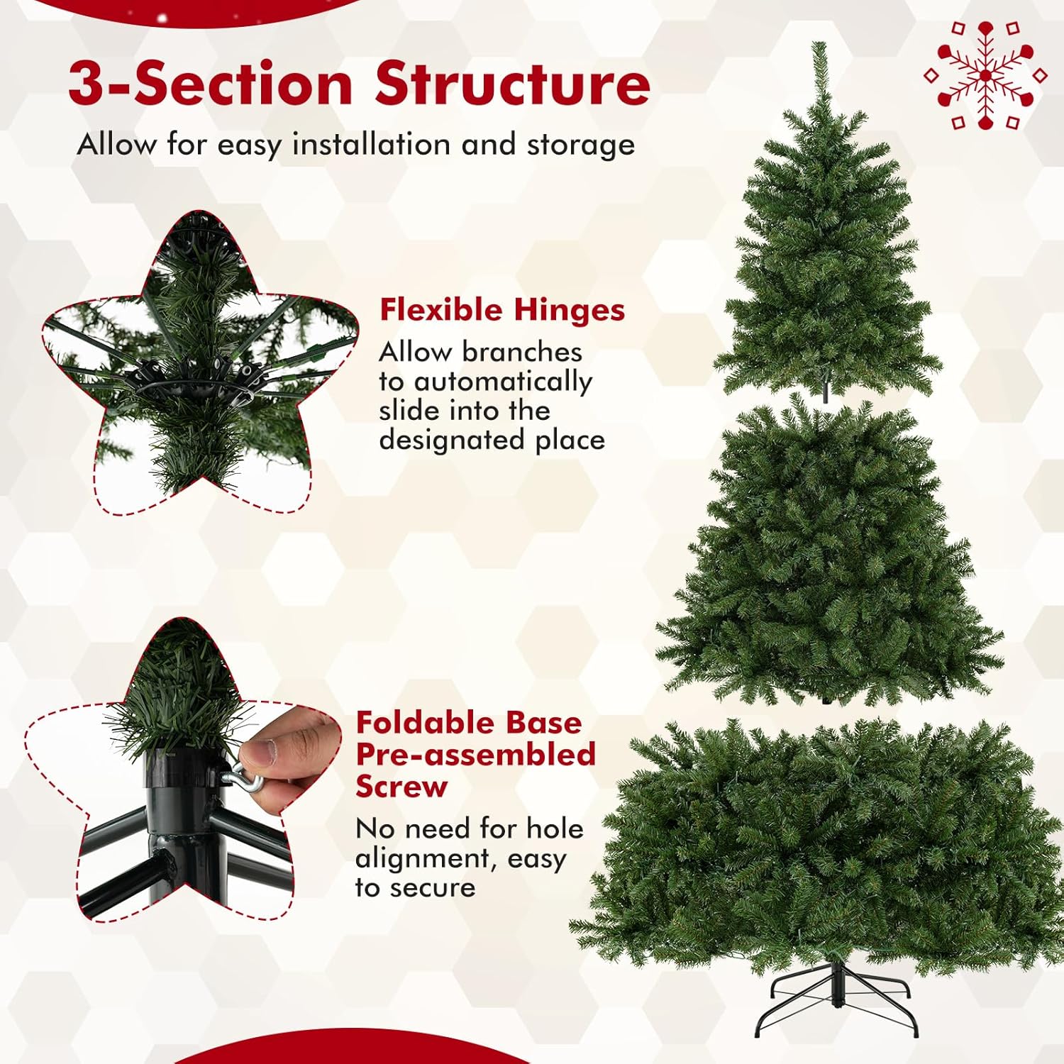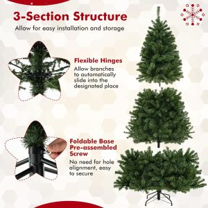 - 🎄Hinged Design for Easy Fluff and Assemble: All hinged construction makes the artificial tree easy to fluff and set up, saving you a lot of time and effort. In addition, the Christmas tree can be divided into 4 sections and placed in a storage bag, allowing you to store it for future reuse conveniently.