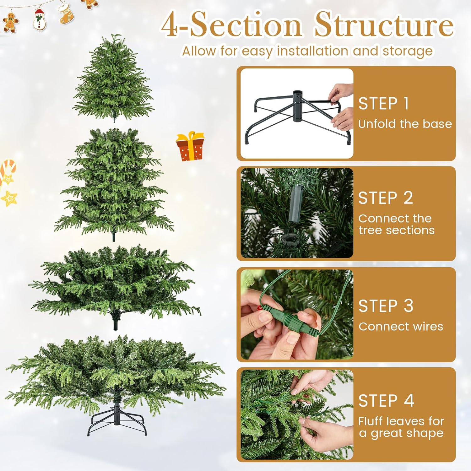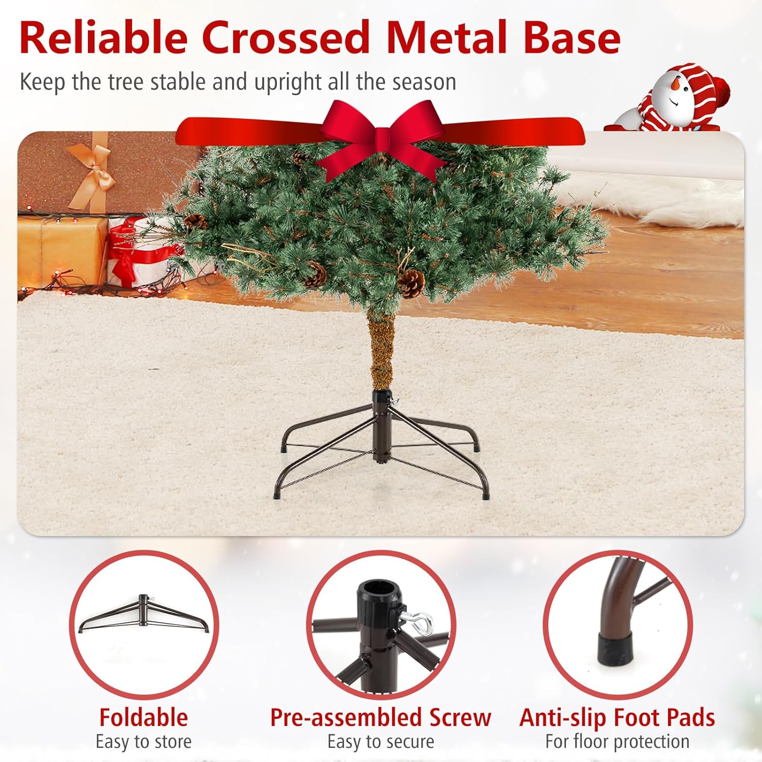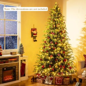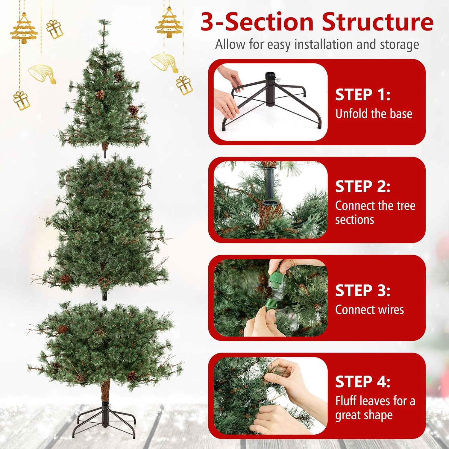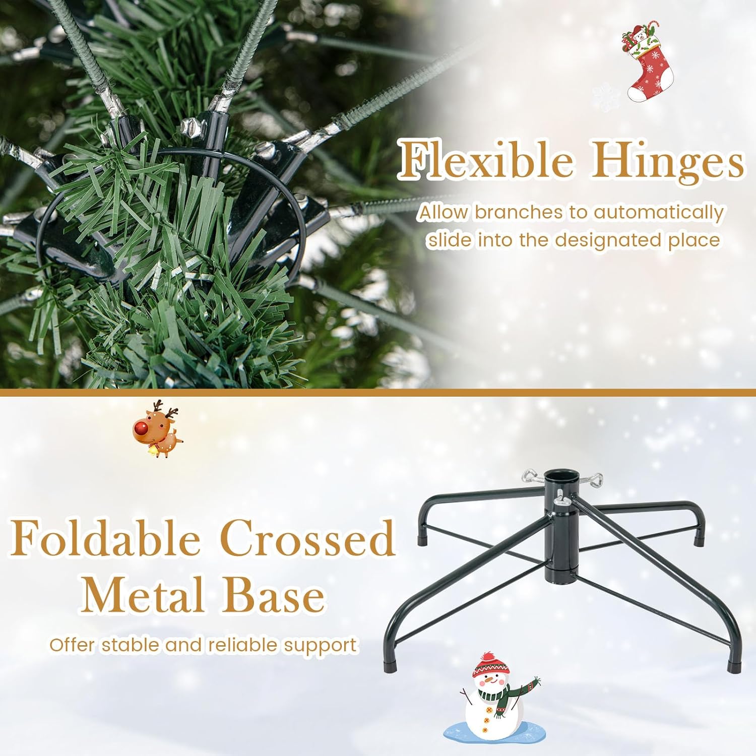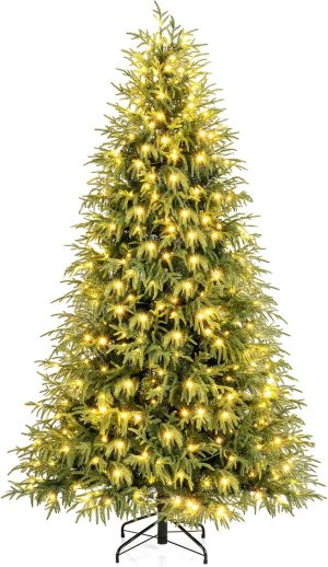 Goplus 8 FT Pre-Lit Artificial Christmas Tree, Hinged Full Xmas Tree with 1470 PVC & Soft TPE Branch Tips, 470 Warm White LED Lights, Foldable Metal Stand, Home Office Holiday Decoration