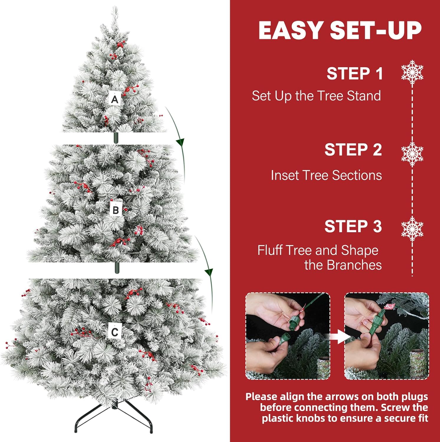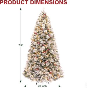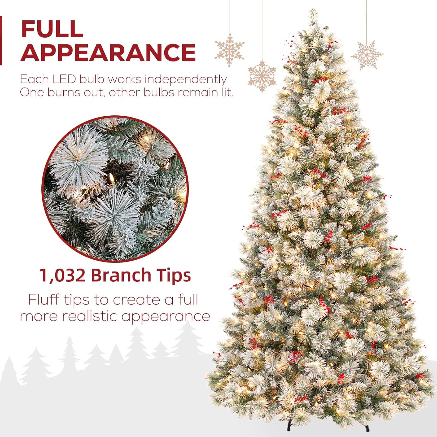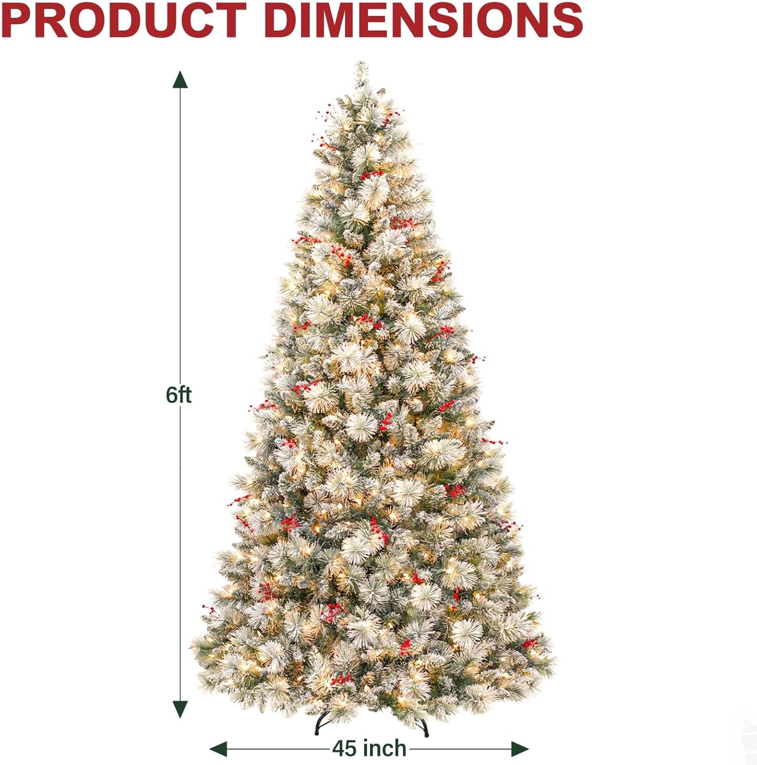 - NATURAL & FULL LOOK: The 6 ft prelit flocked christmas tree boasts 1032 branch tips for a full look. Snow sprinkled branch tips and is trimmed with clusters of berries create a unique wintry feel, pre-strung with 250 warm white lights emitting a warm natural glow. The tree also provides abundant space to showcase your favorite holiday ornaments.