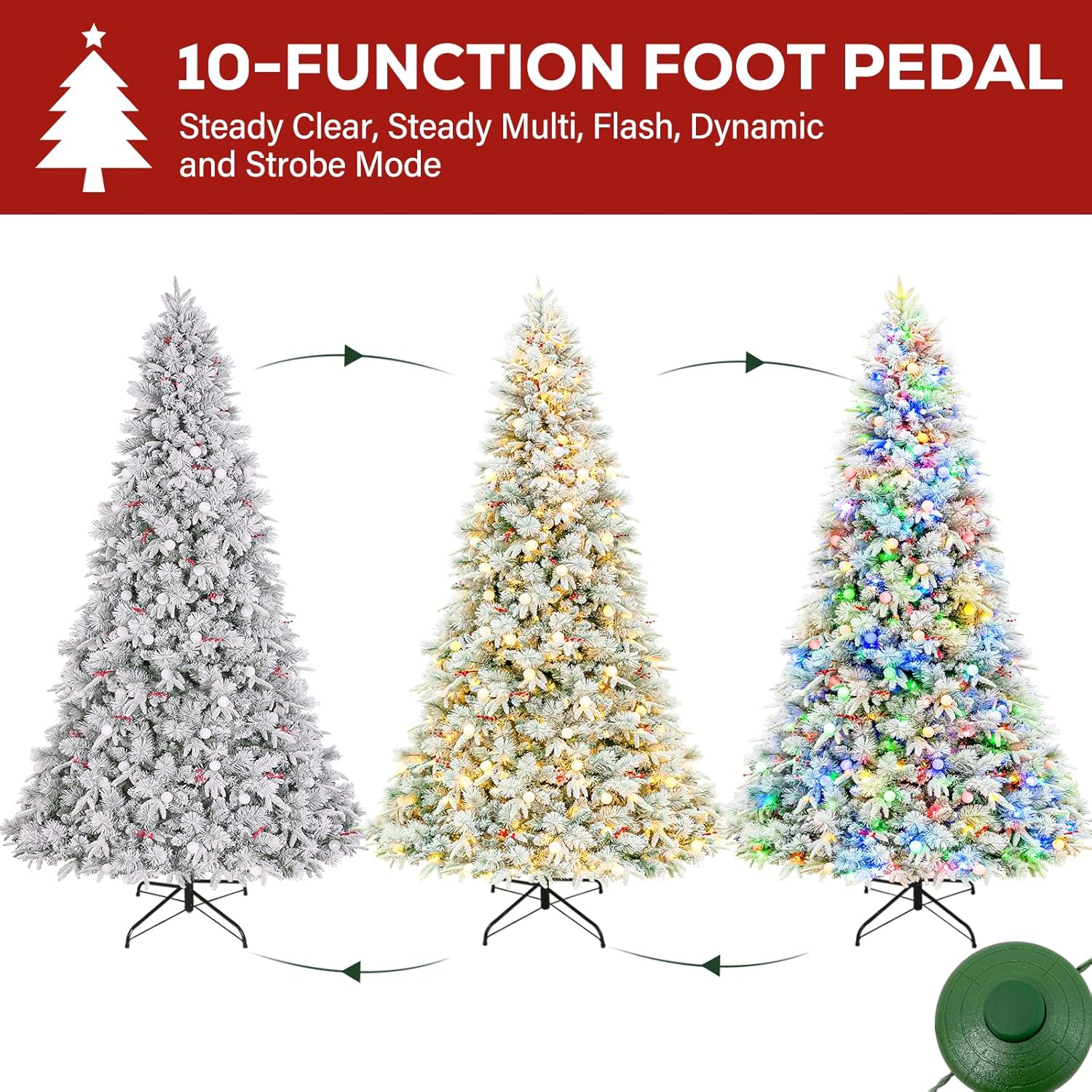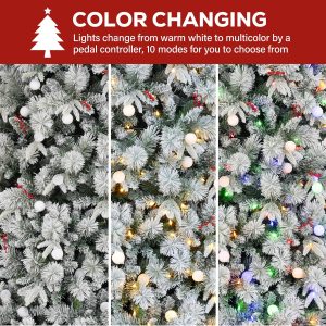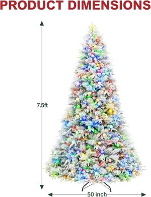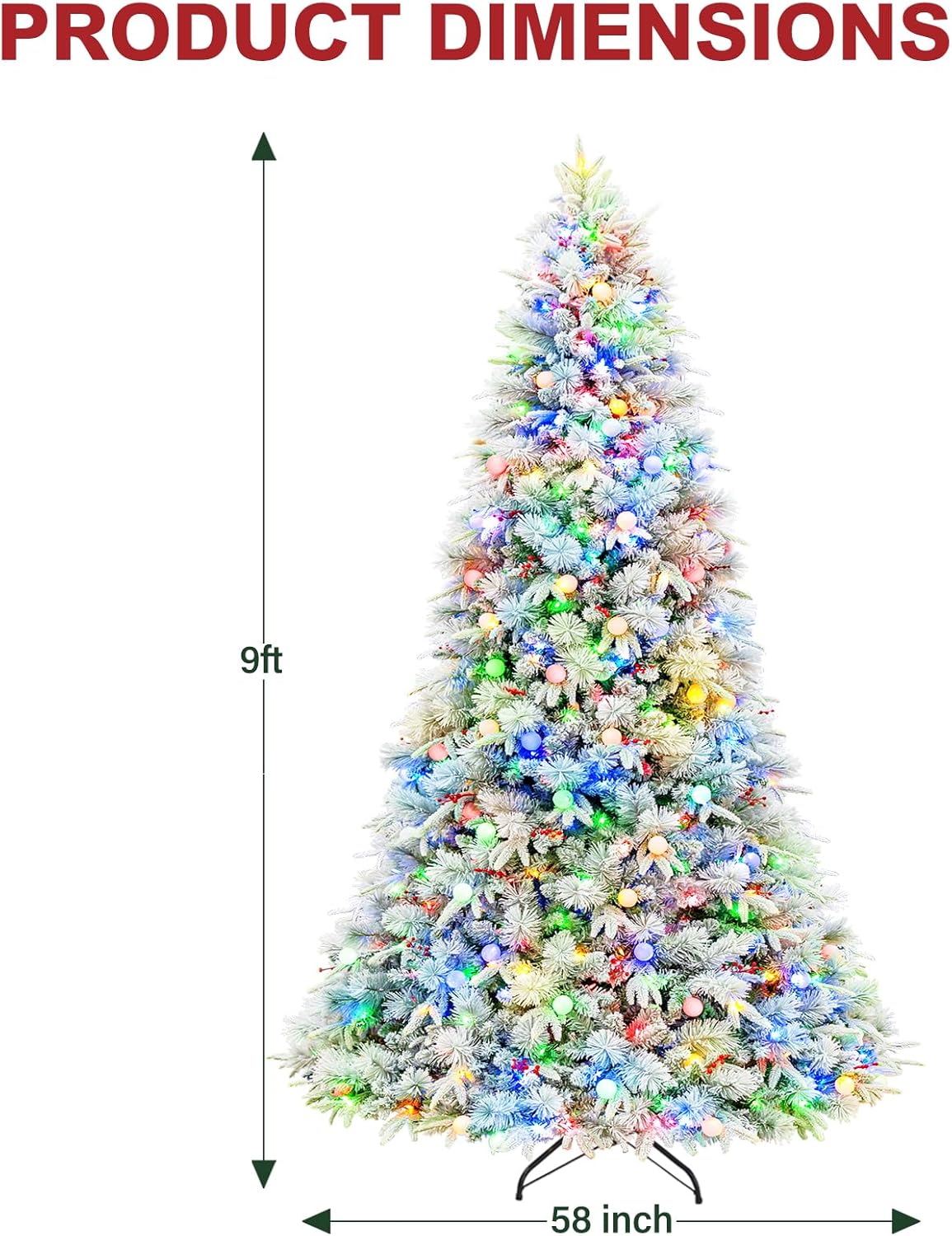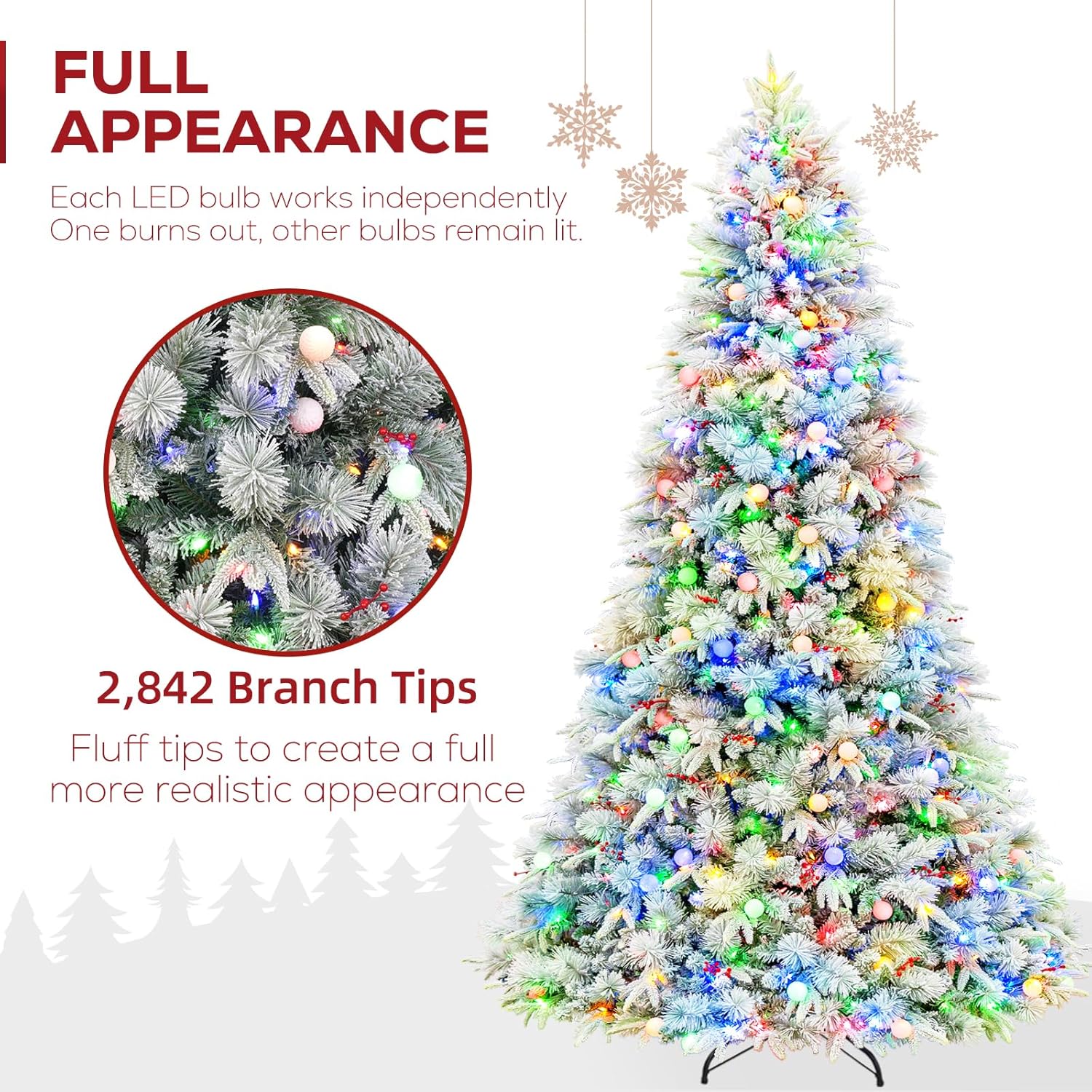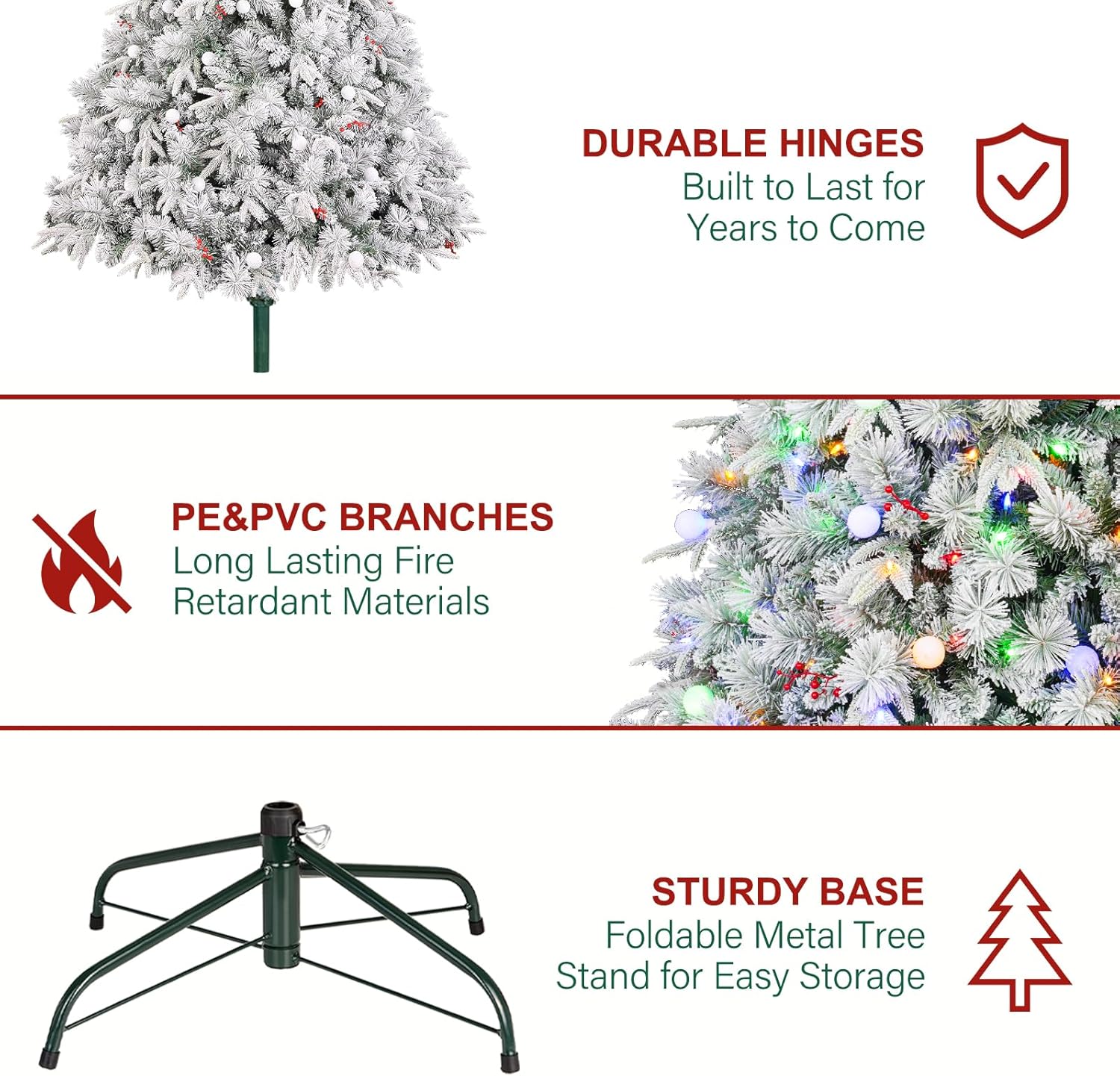 Hykolity 7.5 ft Prelit Flocked Christmas Tree, 450 Multicolor LED Lights, Artificial Christmas Pine Tree with Red Berries, 1608 PE&PVC Branch Tips, Metal Stand and Hinged Branches, 10 Modes