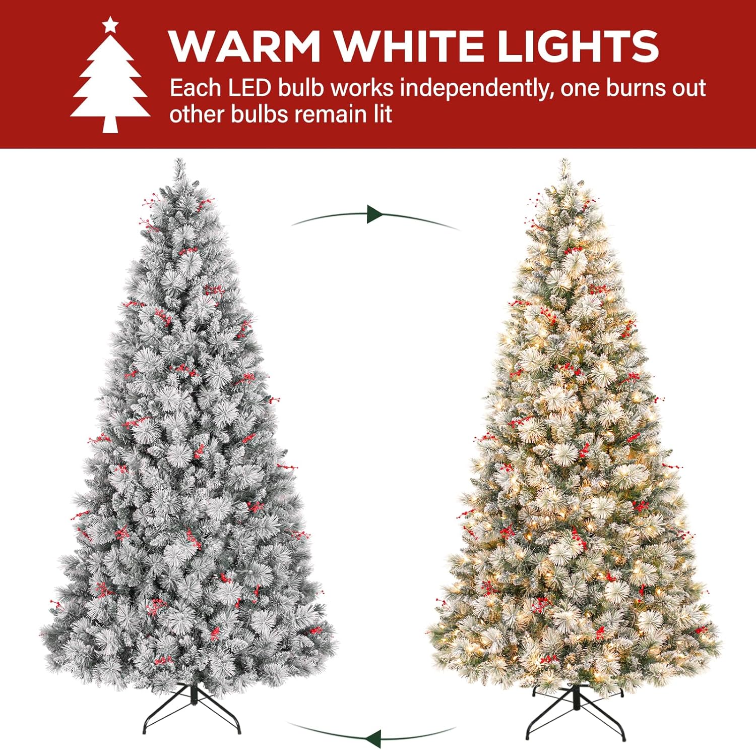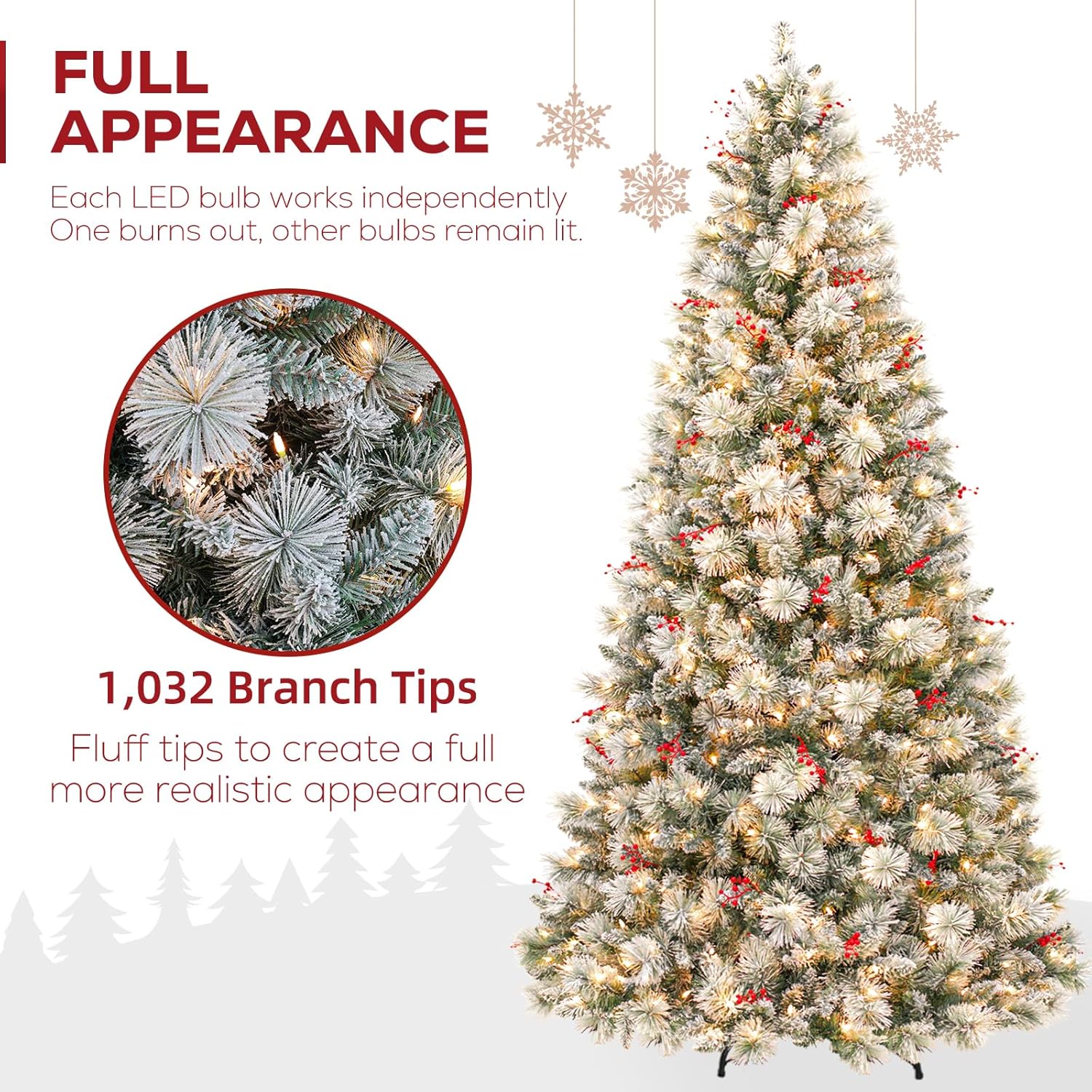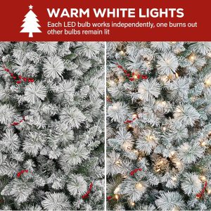 - NATURAL & FULL LOOK: The 7.5 ft lush evergreen snow flocked Christmas tree boasts 1446 branch tips for a full look, snow sprinkled branch tips create a unique wintry feel. Pre-strung with 450 warm white LED lights emitting a warm natural glow. The tree also provides abundant space to showcase your favorite holiday ornaments.