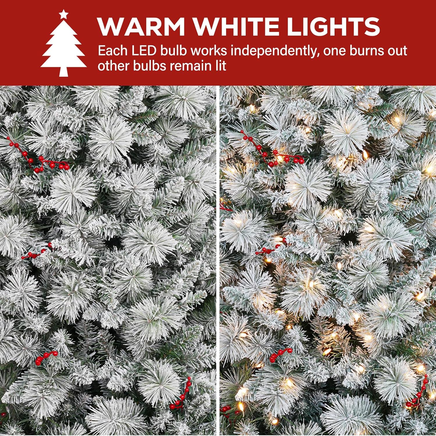 - RELIABLE WARRANTY: Hykolity’s flocked Christmas tree with lights is guaranteed for 1 years. We aim for quality followed up with quality customer service directly provided by manufacturer. We offer free-exchange for any quality problems within warranty.